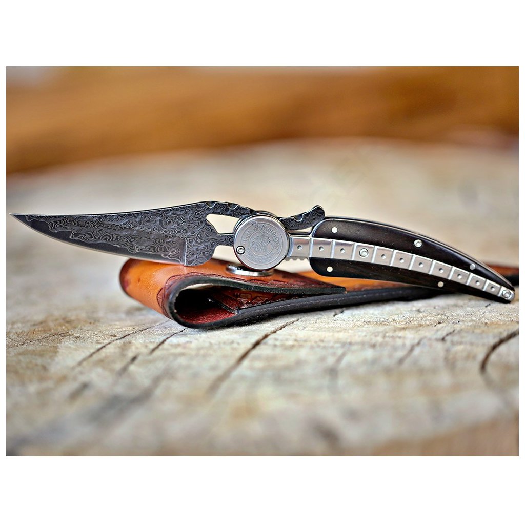 Čepel je vykována z damaškové oceli, jejíž vrstvy tvoří fascinující vzory připomínající tekoucí vodu. Rukojeť je vyrobena z pravého ebenového dřeva, které patří k nejcennějším a nejtvrdším dřevinám světa. Eben je přirozeně odolný vůči vlhkosti a díky své hustotě poskytuje noži vyváženou hmotnost a luxusní pocit při úchopu. Součástí balení je stylové kožené pouzdro pro bezpečné nošení.
