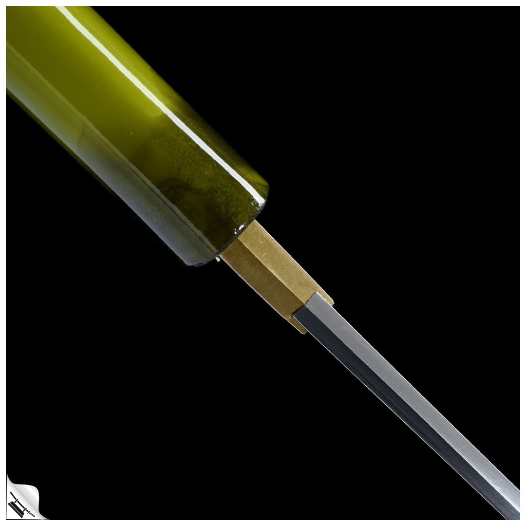 4 cm -Klingenkrümmung (Sori) - 2,2 cm -Hamon - echt, Typ Choji -Habaki - Messing (Länge 2,8 cm) -Tsuka (Griff) aus Bambusholz + Lackierung. Die Klinge ist mit 1 Bambus "mekugi" Stift gesichert
