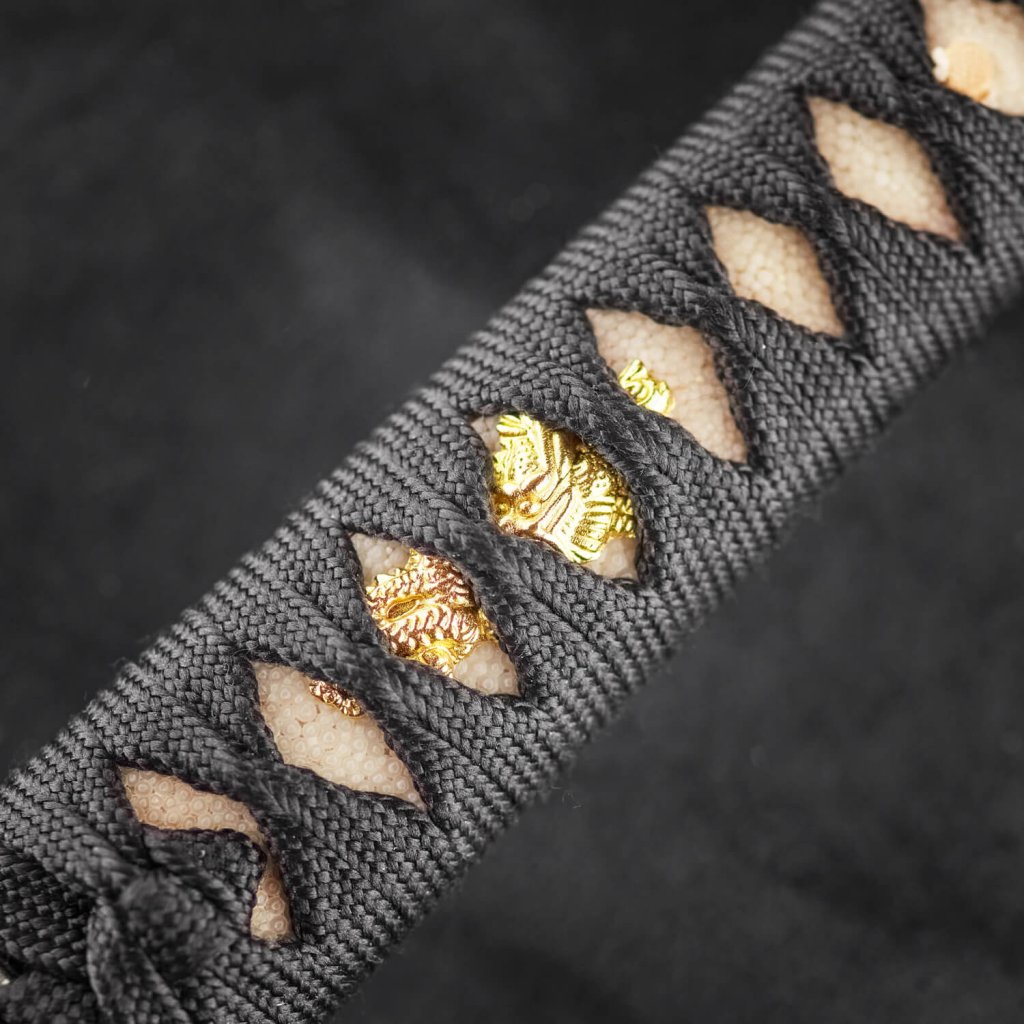 - Tsuka: (Griff) Holzkern, umwickelt mit echtem Rochenleder (Samegawa) mit schwarzer Borte - Ito. Die Klinge des Katana ist mit zwei Mekugi (Bambusstiften) gesichert. Sie können die Klinge vom Griff abnehmen, indem Sie diese Stifte herausziehen. Auf jeder Seite der Tsuka (Griff) befindet sich ein menuki (Ornament unter der Borte). Verziertes Ende des Griffs (Kashira).