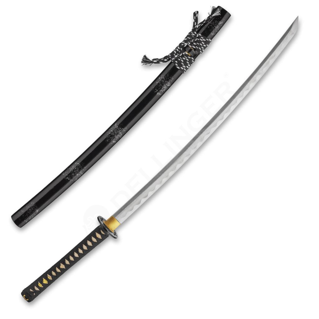 Geschmiedetes japanisches Schwert KATANA mit polierter Imitation der Härtung (hamon). Das scharfe (geschnittene) Samuraischwert KATANA findet seine Verwendung als Dekoration, aber auch für das aktive Kampfsporttraining. Das Katana ist zum Schneiden härterer Materialien nicht ganz geeignet. Der Stahl ist nicht teilgehärtet (Hamon ist nur poliert), er hat einen geringen Härtegrad. Das Hacken von harten Materialien würde Spuren auf der Klinge des Schwertes hinterlassen. Attraktive und scharfe Klinge, schwarz glänzende Saya mit Pusteblumen verziert, plus Tsuka (Griff), die mit echtem Rochenhaut bedeckt ist, all dies macht dieses Katana sehr interessant und begehrenswert. Das Katana wird in einer Leinentasche und einem Karton aufbewahrt. Die Klinge des Katana ist mit einer polierten Imitation der Härtelinie eines Hamons verziert. Unternehmen Dellinger lehnt jede Haftung für Verletzungen und Schäden ab, die durch den Gebrauch entstehen. Bewahren Sie das Katana außerhalb der Reichweite von Kindern auf! Jeder Umgang mit dem Samuraischwert erfolgt auf eigene Verantwortung. Denken Sie daran, dass Sie eine tödliche Waffe in Ihren Händen halten!