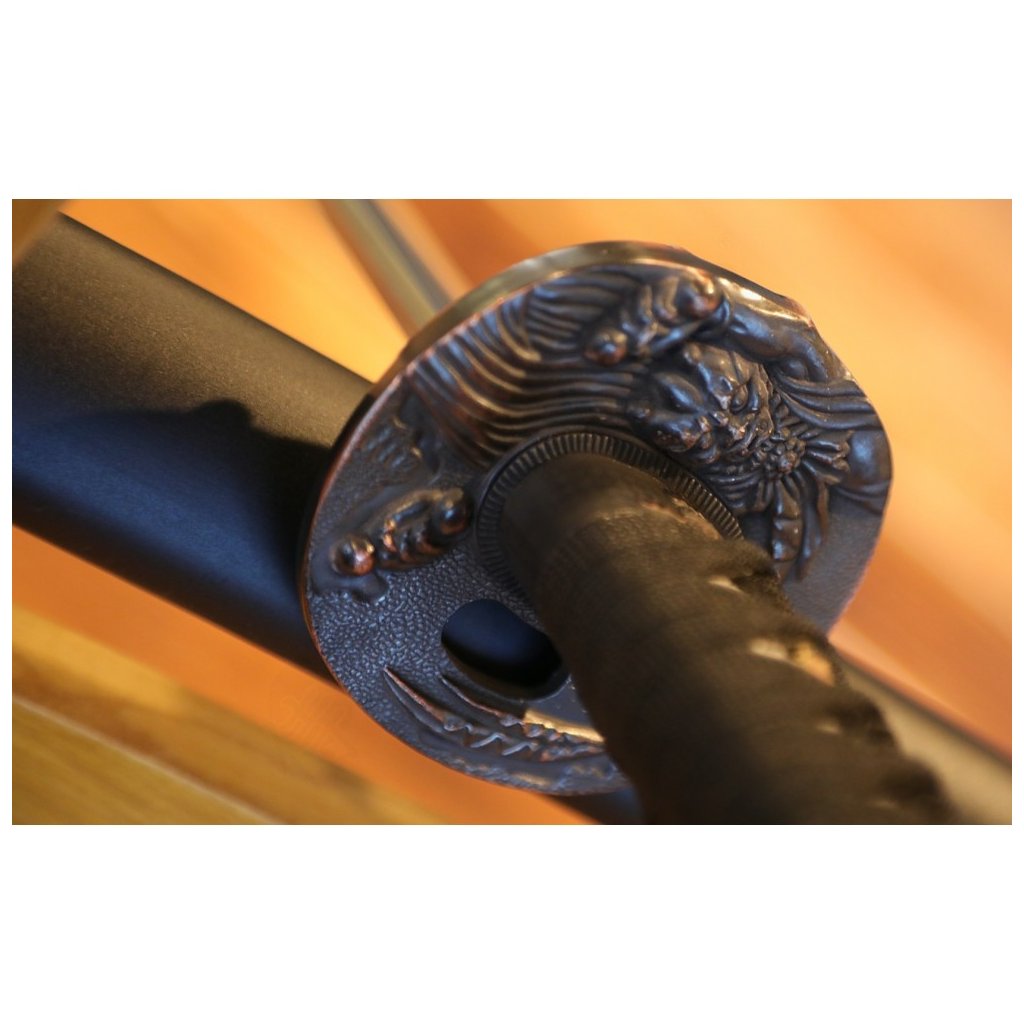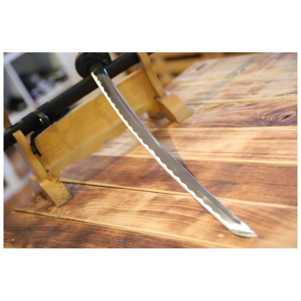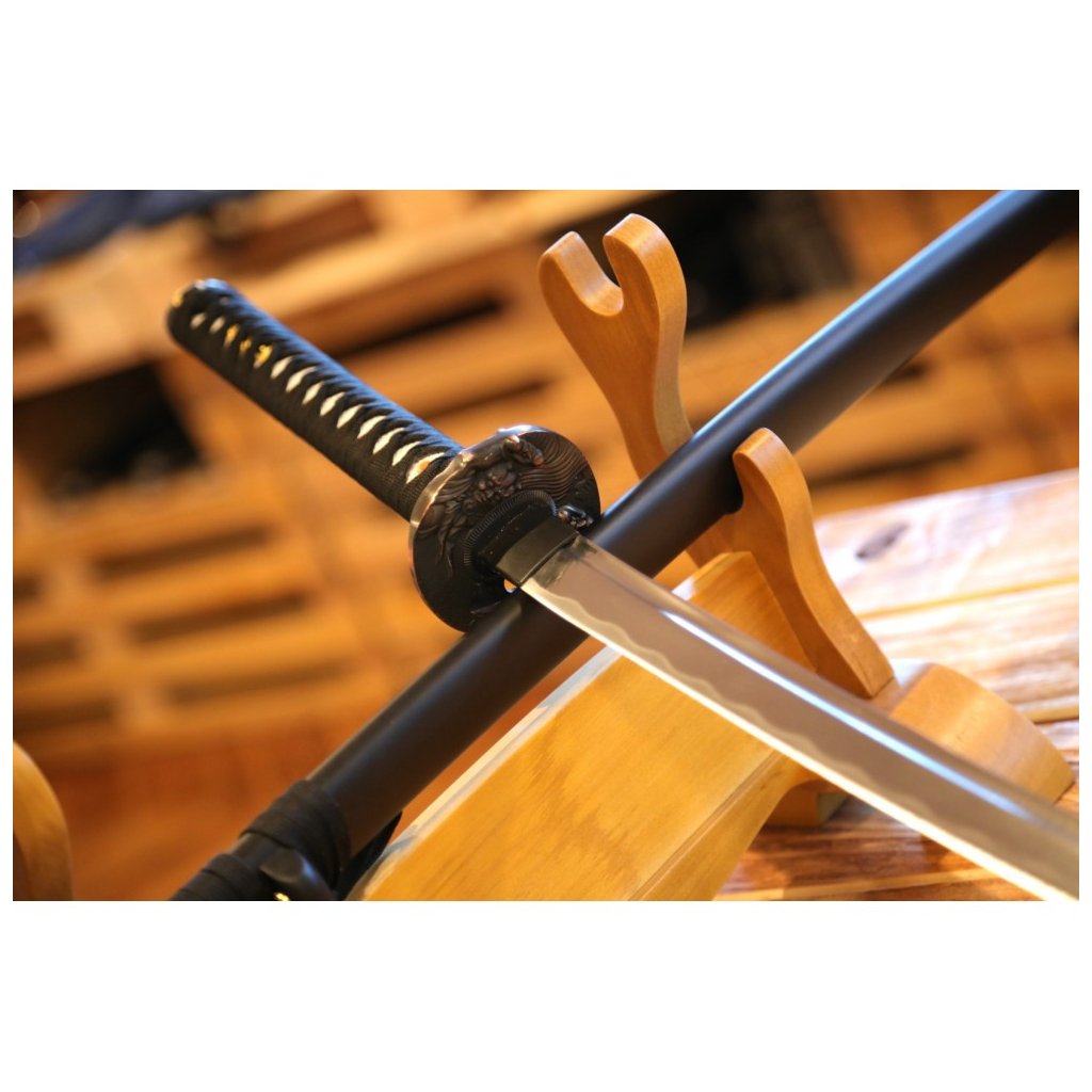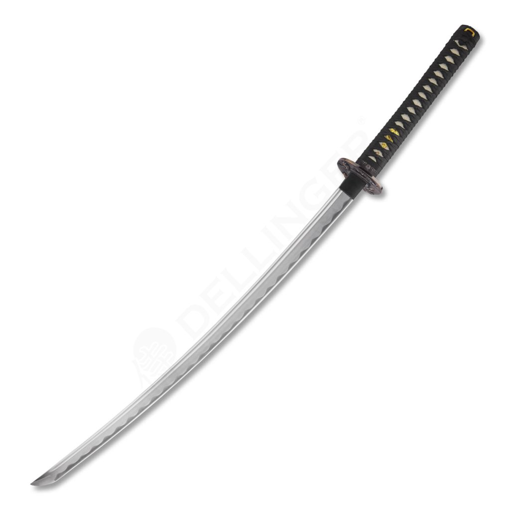 Kovaná replika meče katana s čepelí z kvalitní uhlíkové oceli AISI 1045 disponuje leštěnou imitací kalicí linky (hamon) a funkčním žlábkem Bo-Hi. Tento broušený meč najde své uplatnění jako působivá dekorace, ale díky své konstrukci je vhodný i pro aktivní nácvik forem bojových umění. Žlábek Bo-Hi při správně provedeném seku způsobuje akustický efekt (tachi kaze), což umožňuje ověřit technickou přesnost tnutí. Vzhledem k monokompozitní konstrukci (tvrdost cca 48 HRC) není tento model určen pro sekání tvrdých materiálů. Elegantní černá matná saya a tsuka potažená pravou rejnočí kůží dělají z této katany unikátní kousek pro každého milovníka japonské historie. Firma Dellinger klade důraz na bezpečnost a doporučuje meč užívat výhradně k dekorativním a tréninkovým účelům.
