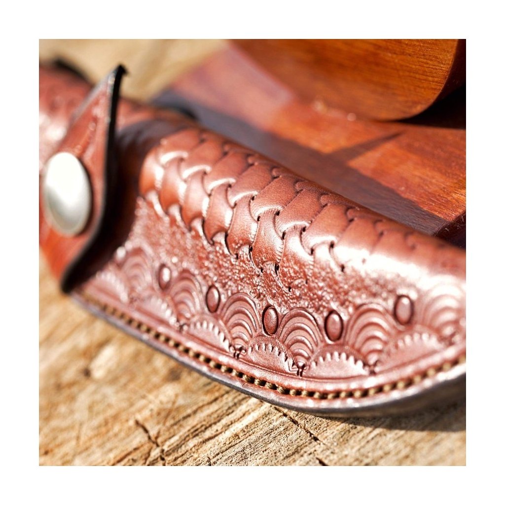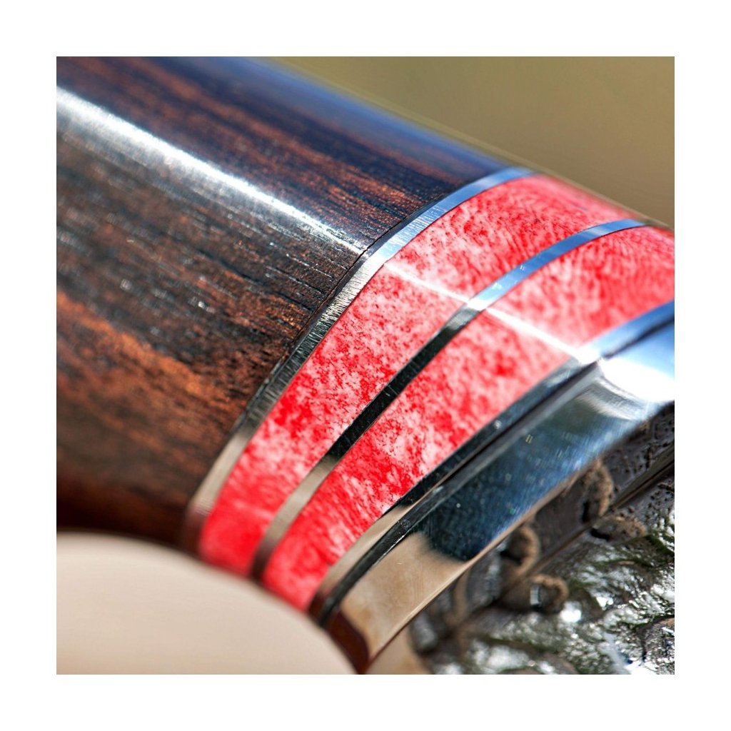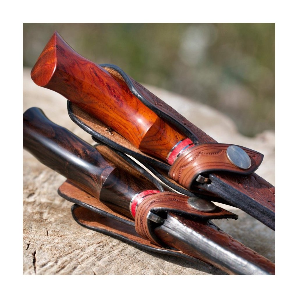Rukojeť je vyrobena z exotického ebenového dřeva v unikátní kombinaci s červenou velbloudí kostí. Eben vyniká svou přirozenou hustotou, odolností a hlubokou tmavou barvou. Ergonomický tvar rukojeti zajišťuje bezpečný úchop v každé situaci. Součástí balení je pouzdro z prémiové argentinské hovězí kůže s dekorativním motivem.
