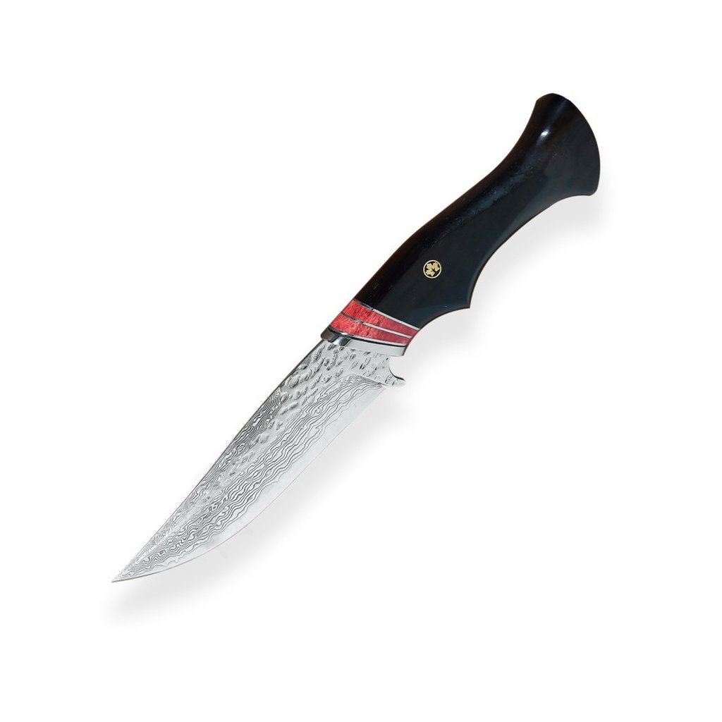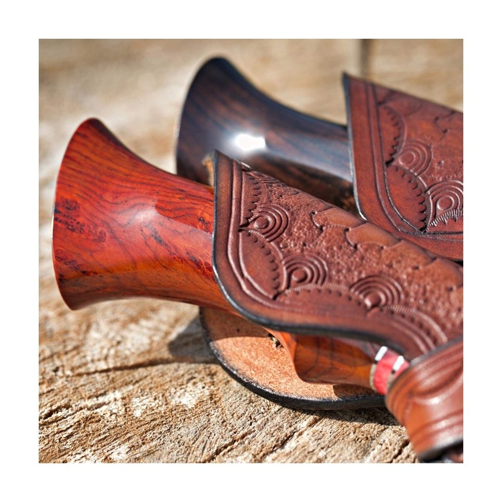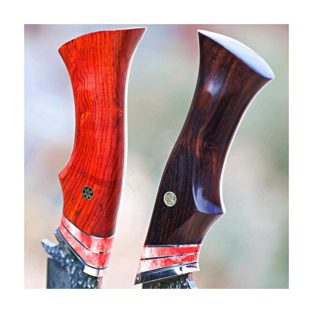 Rukojeť je vyrobena z exotického ebenového dřeva v unikátní kombinaci s červenou velbloudí kostí. Eben vyniká svou přirozenou hustotou, odolností a hlubokou tmavou barvou. Ergonomický tvar rukojeti zajišťuje bezpečný úchop v každé situaci. Součástí balení je pouzdro z prémiové argentinské hovězí kůže s dekorativním motivem.