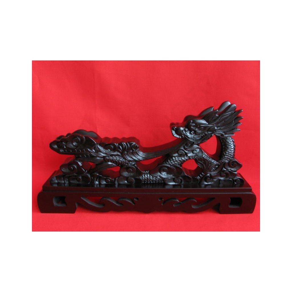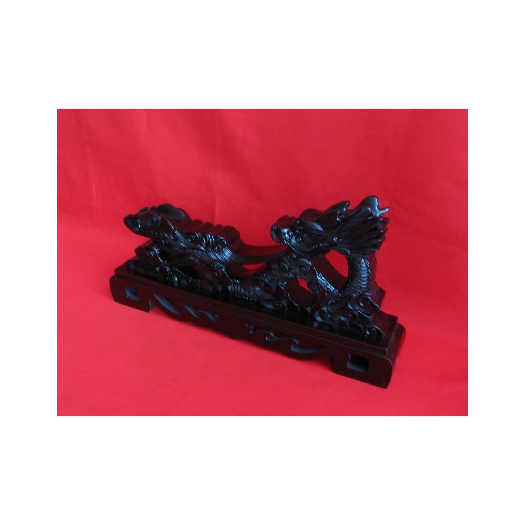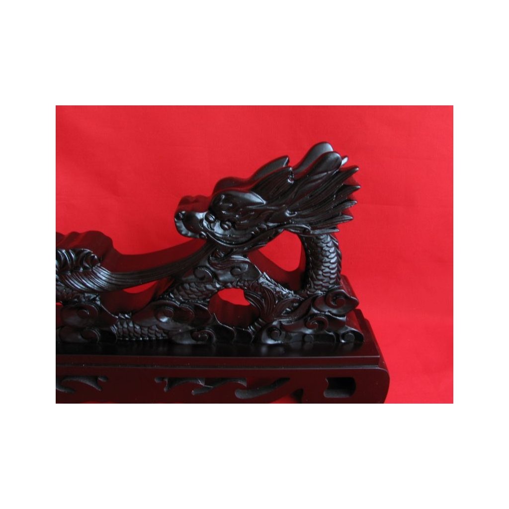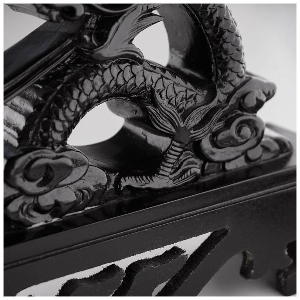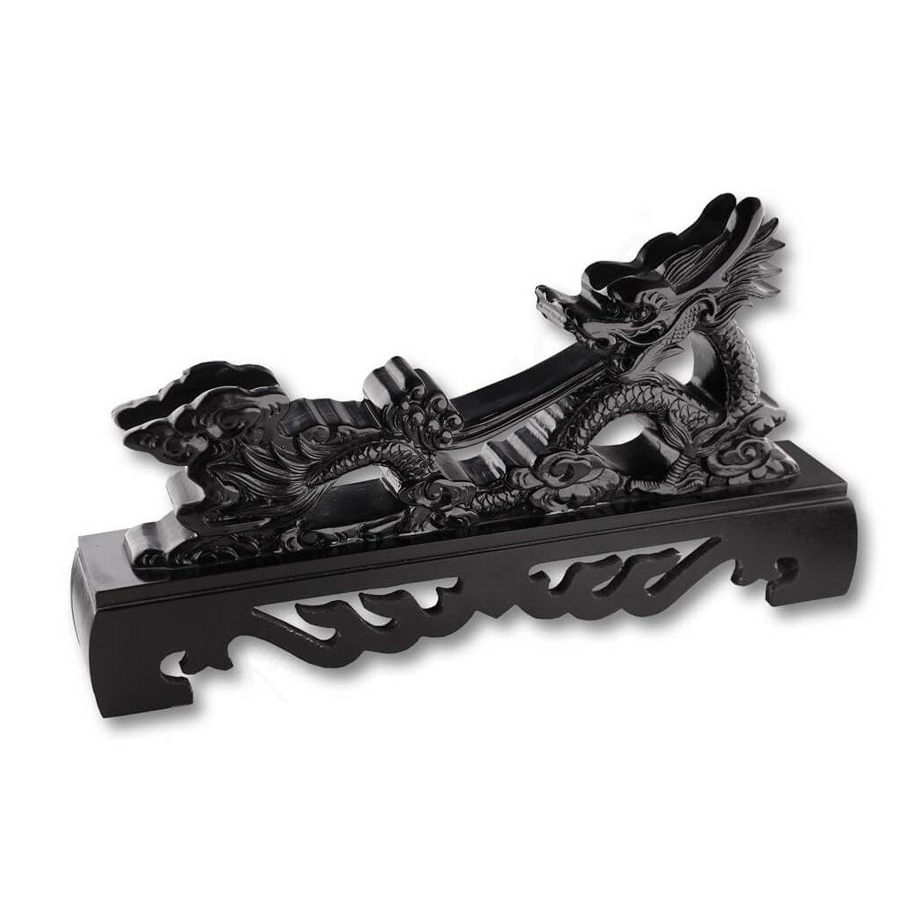 Prezentujte svůj oblíbený meč, katanu, wakizashi nebo tanto stylově na tomto unikátním výstavním stojanu. Tento krásný stojánek ve tvaru draka je vyroben z dřevěného masivu a jeho povrch je opatřen černým lakem ve vysokém lesku. Drak jako symbol síly a ochrany dodá vaší sbírce autentickou atmosféru.