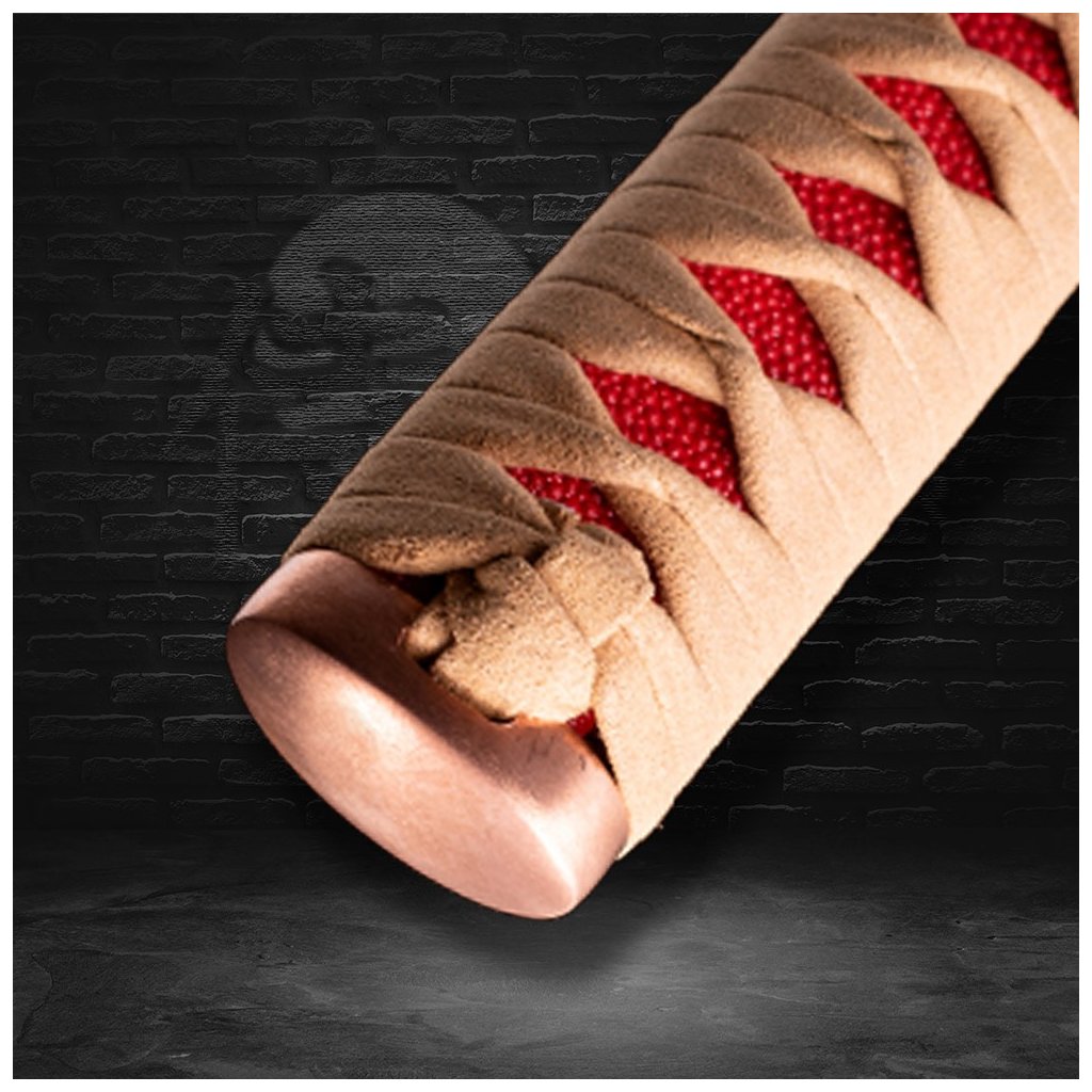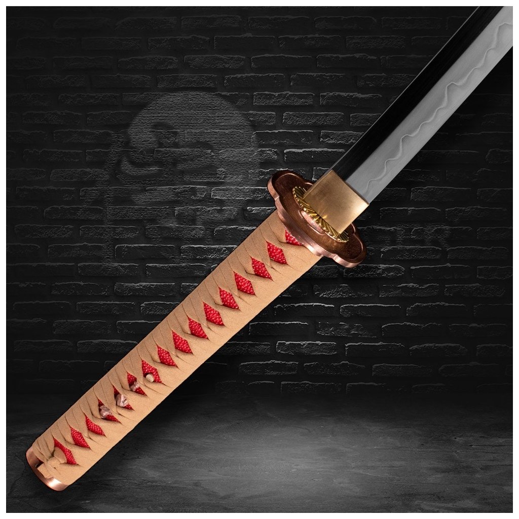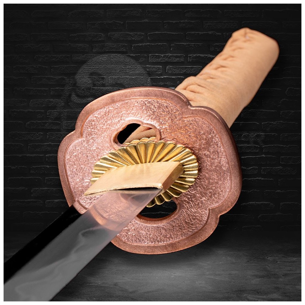- Tsuka (handle) - wooden core, covered with genuine stingray leather (Samegawa), ITO suede leather wrap. Blade secured with 2 bamboo "mekugi" pins.