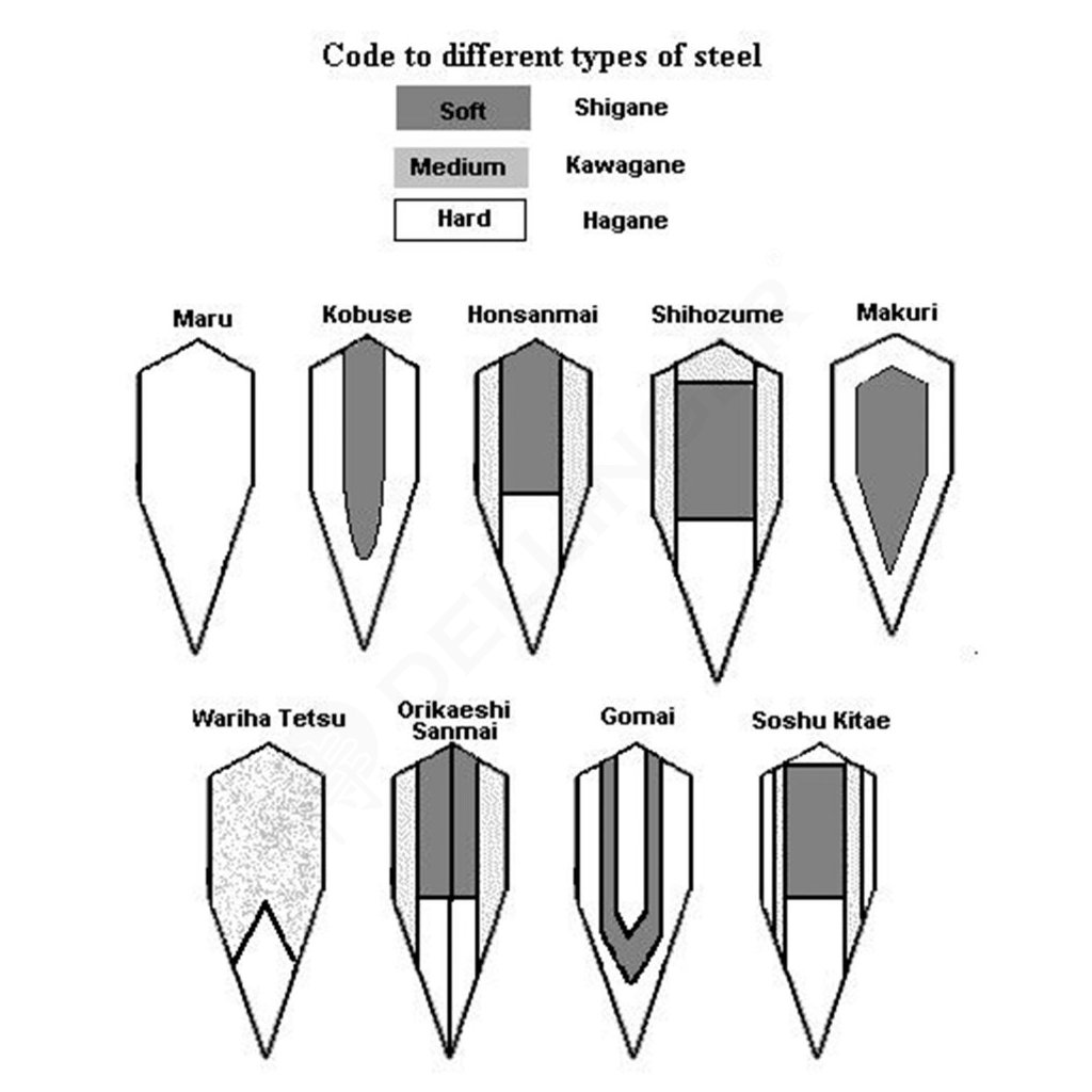 - Blade material - T-10 Hi-carbon steel, honsanmai lamination, blade hardness (Hasaki) 58HRC