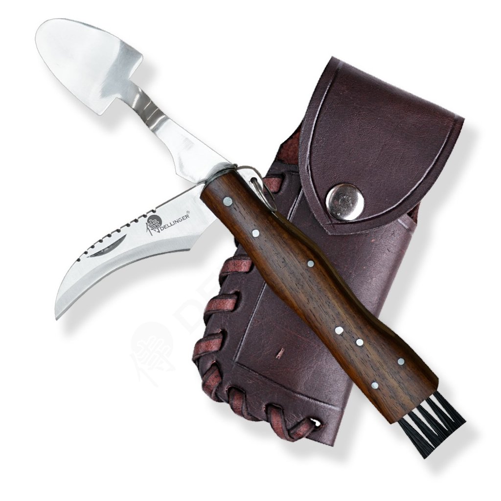 Součástí tohoto praktického setu je výklopná lopatka pro šetrné vyjmutí houby ze země a jemný štěteček na konci rukojeti pro okamžité očištění od jehličí a hlíny. Nůž je dodáván v ručně zpracovaném koženém pouzdru, které lze snadno připevnit na pásek.