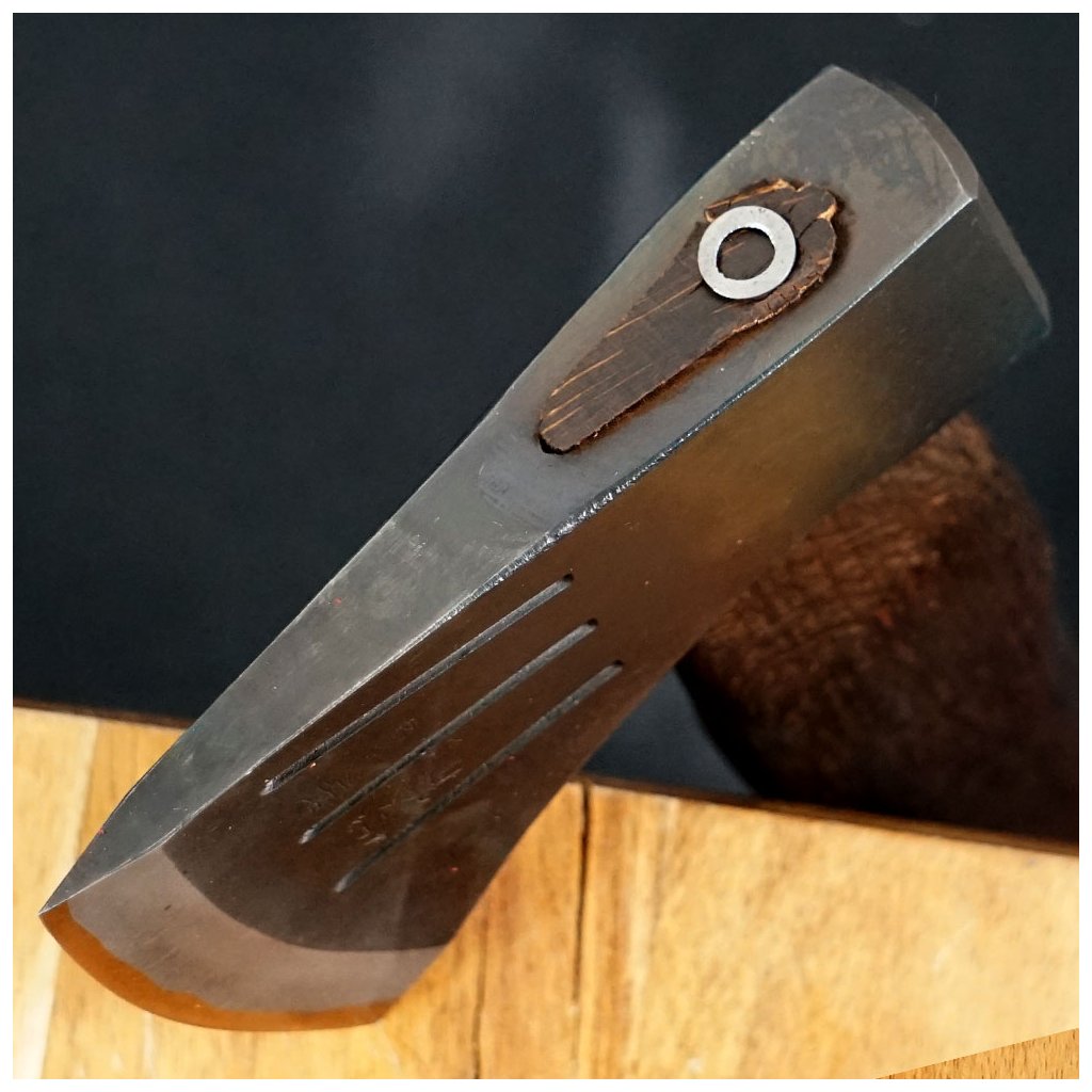 Hlava nástroje je vyrobena tradiční metodou Warikomi – do těla z měkčí oceli je vkováno tvrdé řezné jádro z uhlíkové oceli 1045. Tato sendvičová konstrukce zajišťuje vysokou stabilitu a dlouhou životnost. Každý kus nese značku certifikátu tradiční výroby, zavedeného japonskou vládou pro ochranu historických kovářských technik. Hlava je zdobena tradičními drážkami – sedm pruhů reprezentuje posvátné hory a dle legend přináší řemeslníkovi štěstí.