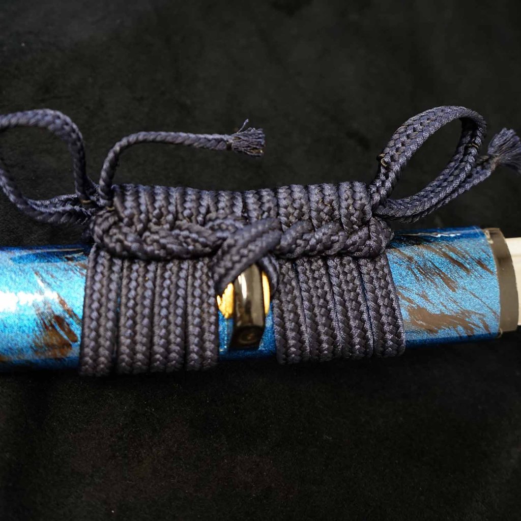 Rukojeť je omotaná modrou šňůrou ve stylu hineri-maki, který je známý svou texturou a luxusním vzhledem. Jemně prosvítající mosazné menuki ve tvaru vějiře - symbolizuje otevřenost, štěstí a postupné rozvíjení života (vějíř se rozvírá jako symbol nových možností) - ty dotvářejí dojem harmonie a propojení s japonskou symbolikou. Omotávka poskytuje pevný, pohodlný úchop a zároveň podtrhuje vizuální eleganci celého meče.