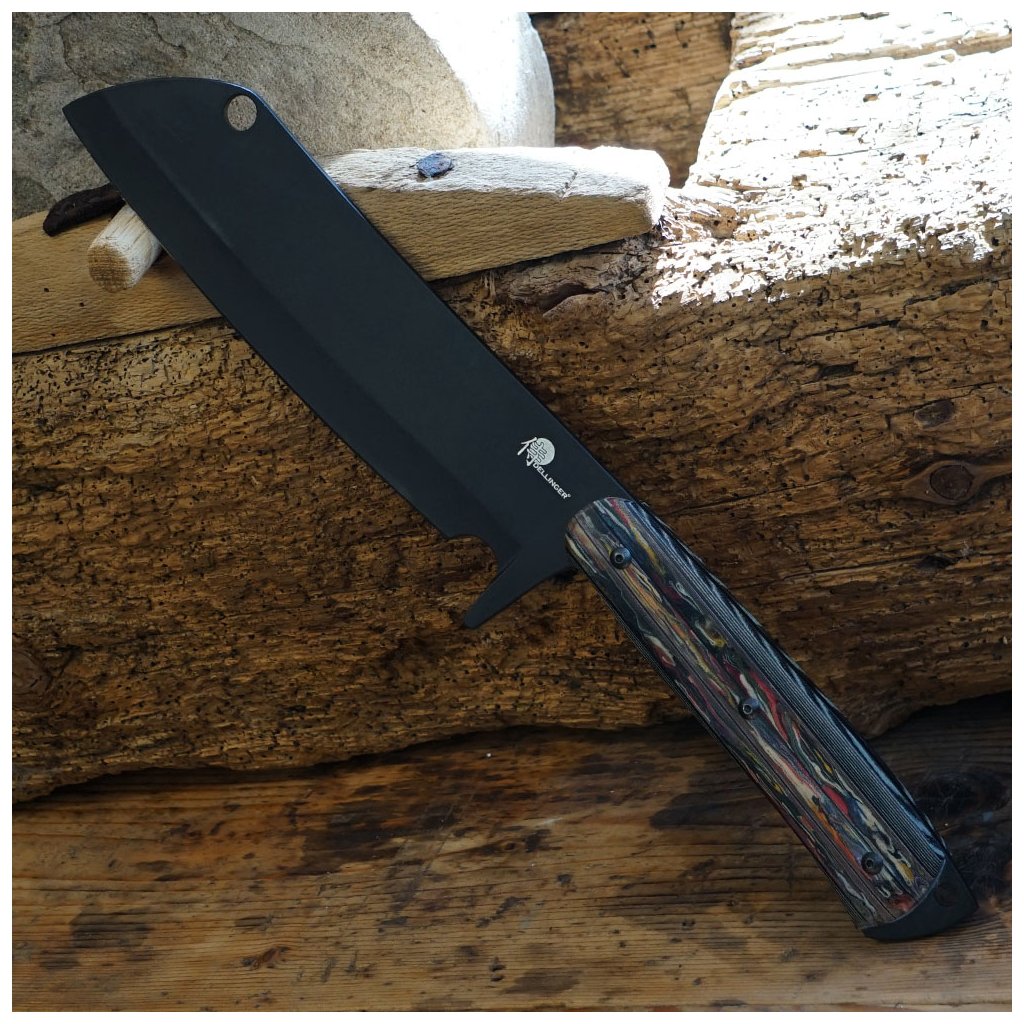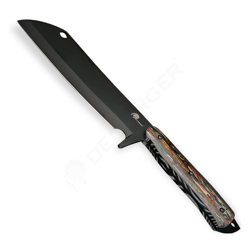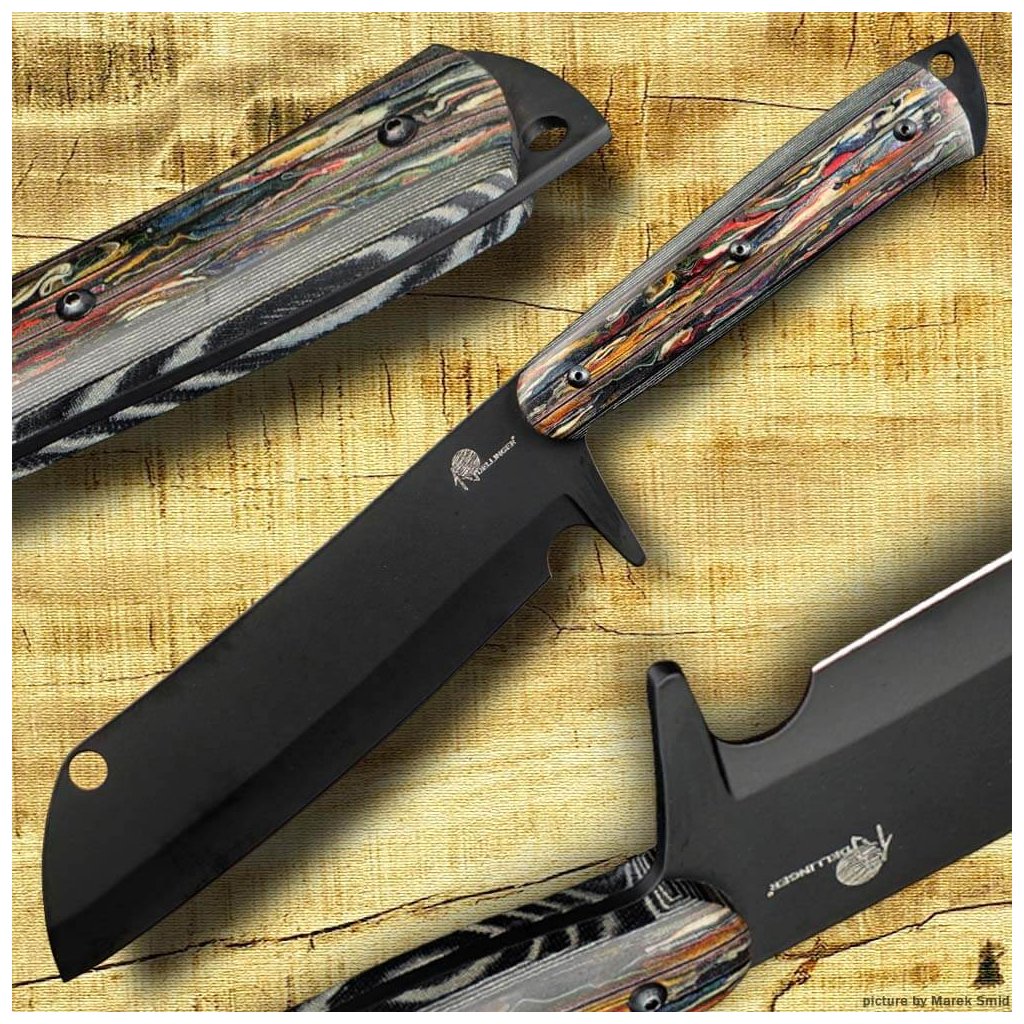 Mačeta Dellinger Ravenage s rukojetí z barevné Micarty je ručně kovaná a zpracovaná z oceli D2. Čepel mačety má povrchovou úpravu black stonewashed. Využít ji můžete jak v kuchyni na krájení a sekání zeleniny, masa a kostí, tak pro práce venku jako je kácení stromů, úprava zahrady nebo příprava dřeva pro oheň. Je to silný nástroj s dlouhou a širokou čepelí, což umožňuje provádět silné řezy a snadno pronikat do husté vegetace. Mačeta Dellinger Ravenage má na špičce čepele zaoblený konec, což umožňuje provádět sekání s rotačním pohybem.
