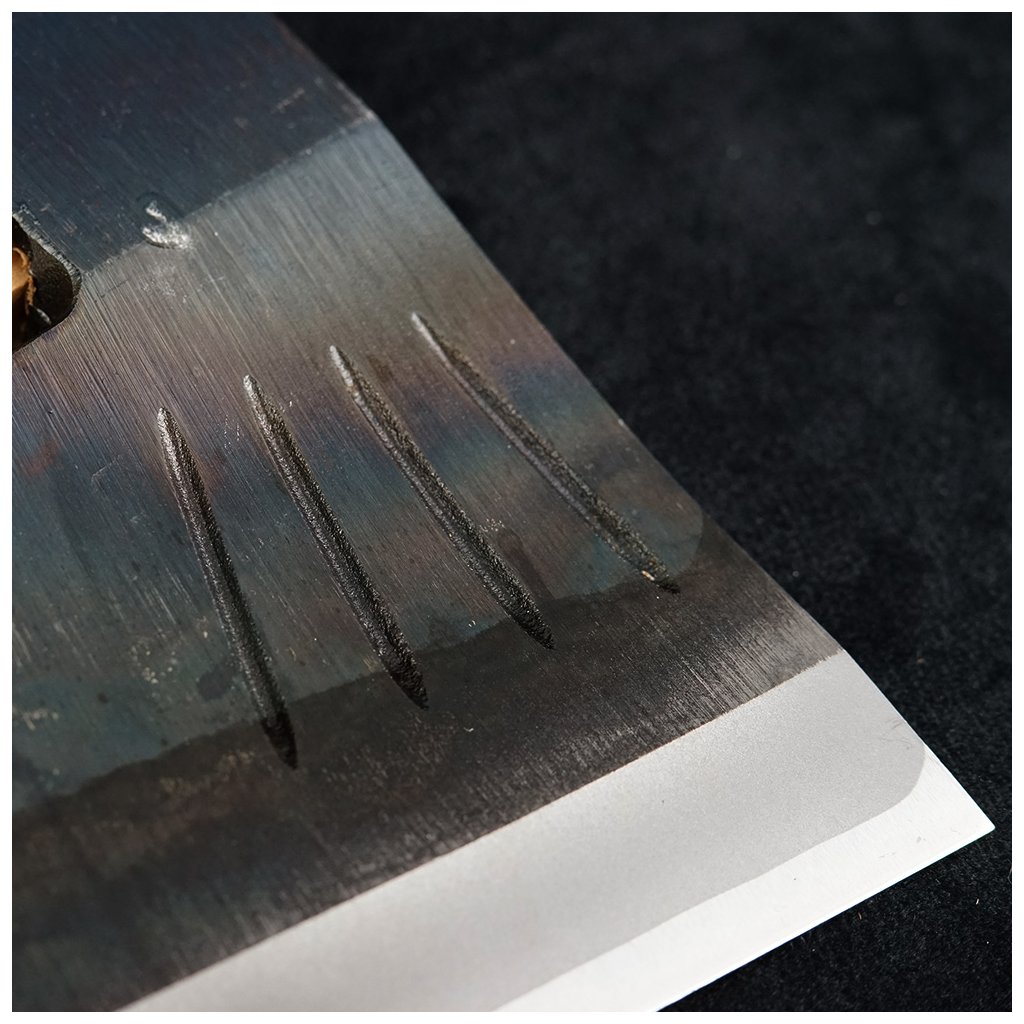 Unikátnost přírodních materiálů Každý kus je ručně vyráběný originál z přírodních materiálů. Textura dřeva i vzhled kované oceli se mohou mírně lišit, což potvrzuje autenticitu ruční práce z dílny Mizuno Seisakujo. |