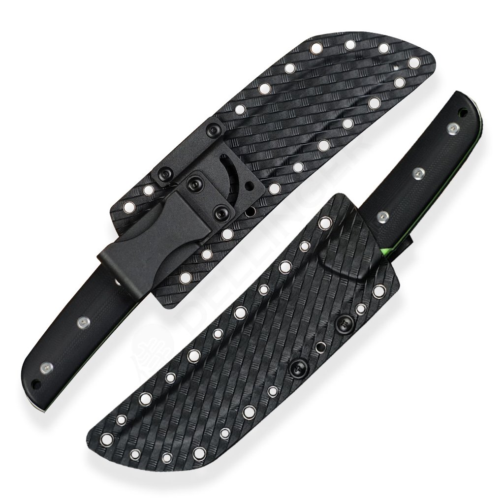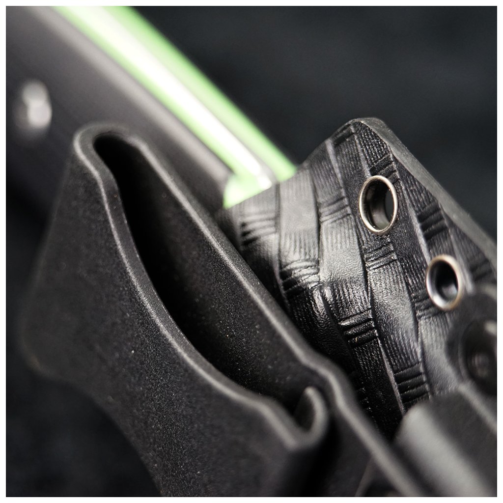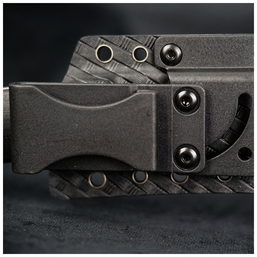Nůž je vybaven kydexovým pouzdrem, které je často používáno pro extrémní a taktické prostředí. Je vyrobeno z materiálu nazývaného Kydex, což je termoplastický polymer s vysokou pevností a odolností. Tento materiál je oblíbený díky své schopnosti udržet pevný tvar a odolat opotřebení i za extrémních podmínek. Pouzdro je navrženo tak, aby drželo nůž bezpečně a pevně na místě, aniž by mu způsobovalo poškození. Materiál Kydex je flexibilní a přizpůsobivý, což umožňuje přesné přilnutí k noži a zajištění jeho stability.