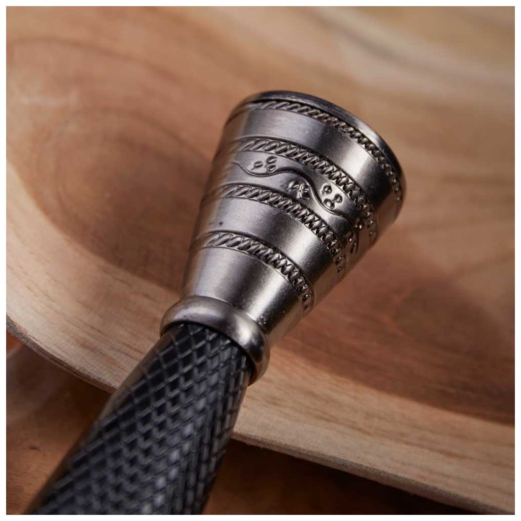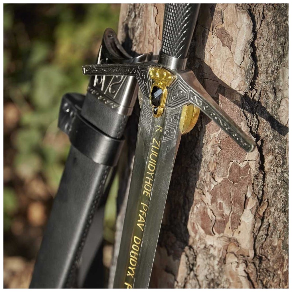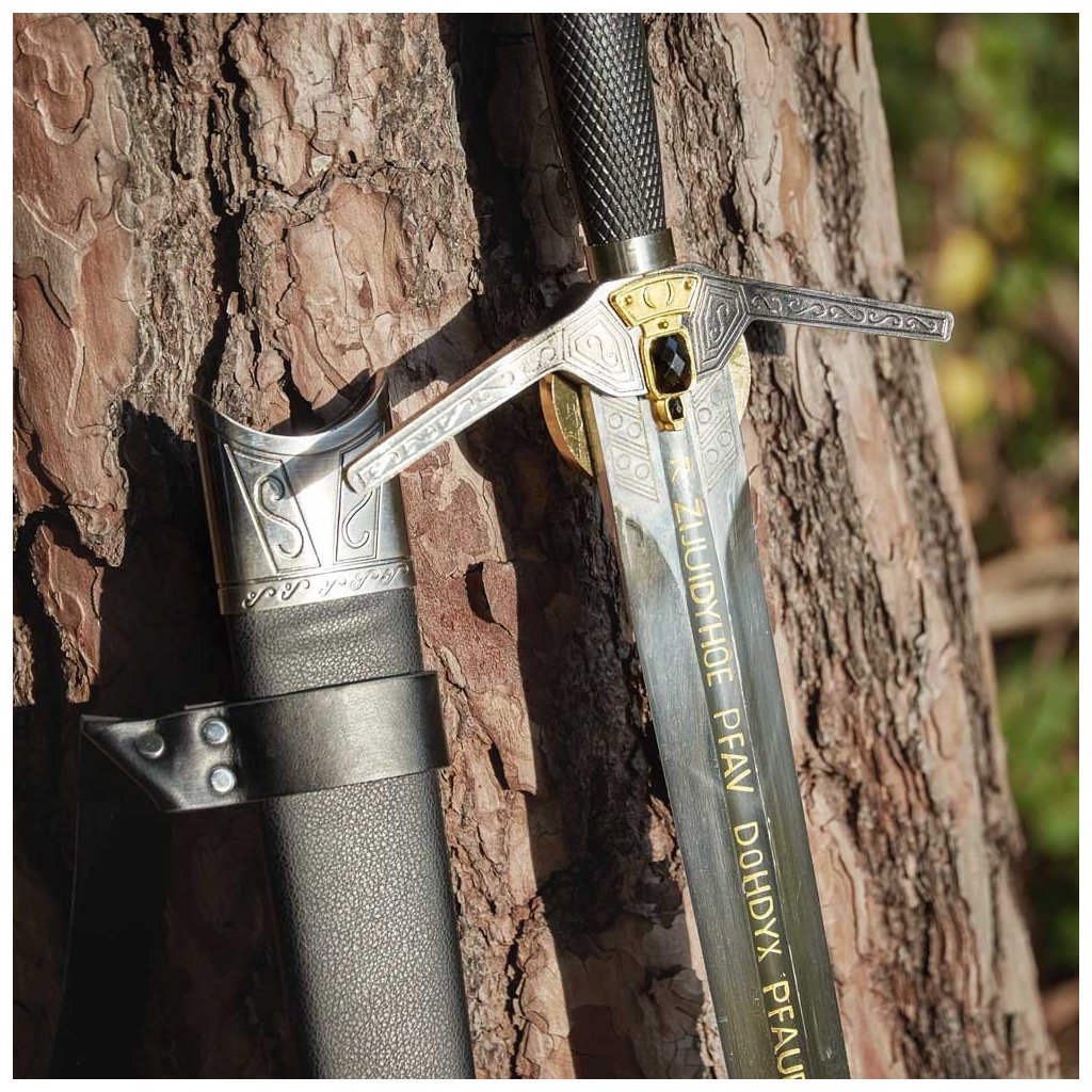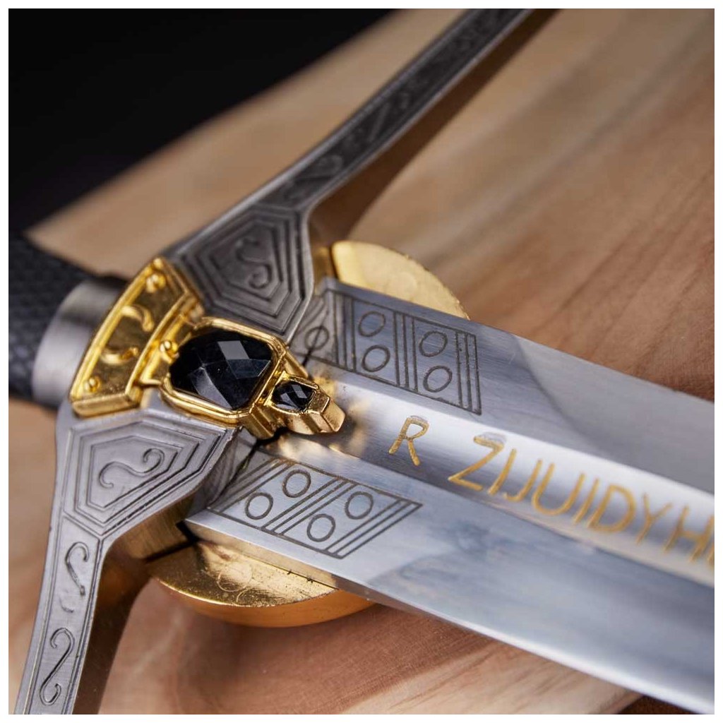 Masivní ocelová záštita s propracovaným reliéfem a válcovitá hlavice dodávají meči autentický vzhled známý z fantasy série. Pogumovaná rukojeť zajišťuje pevný a pohodlný úchop při manipulaci. Meč je dodáván v dřevěném pouzdru potaženém černou koženkou s kovovým zdobením a praktickým popruhem na přenášení.