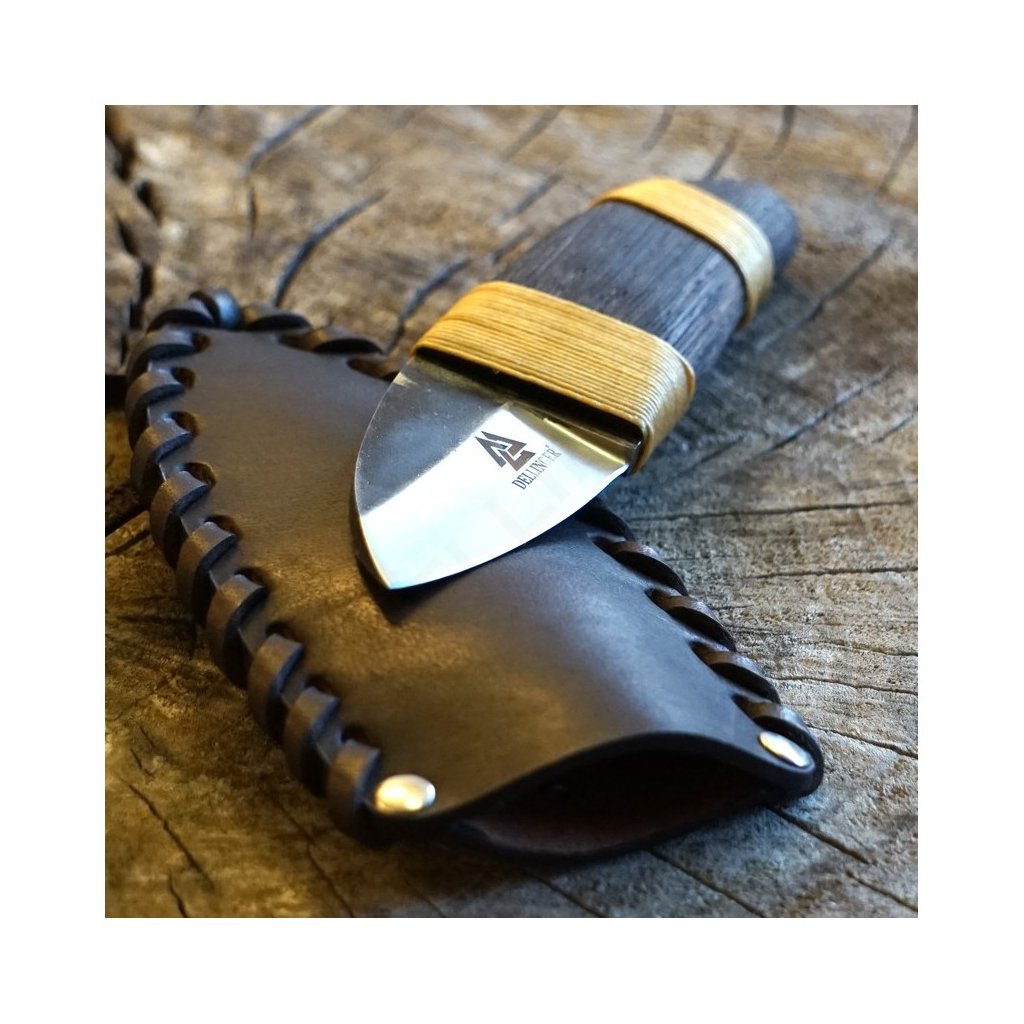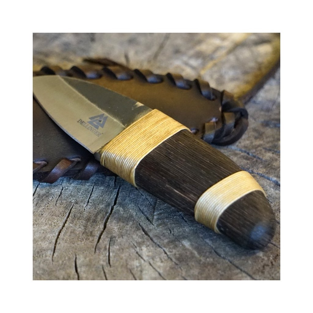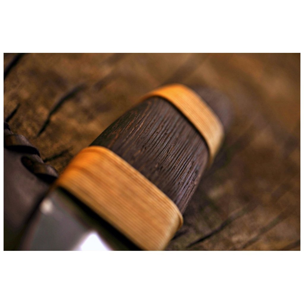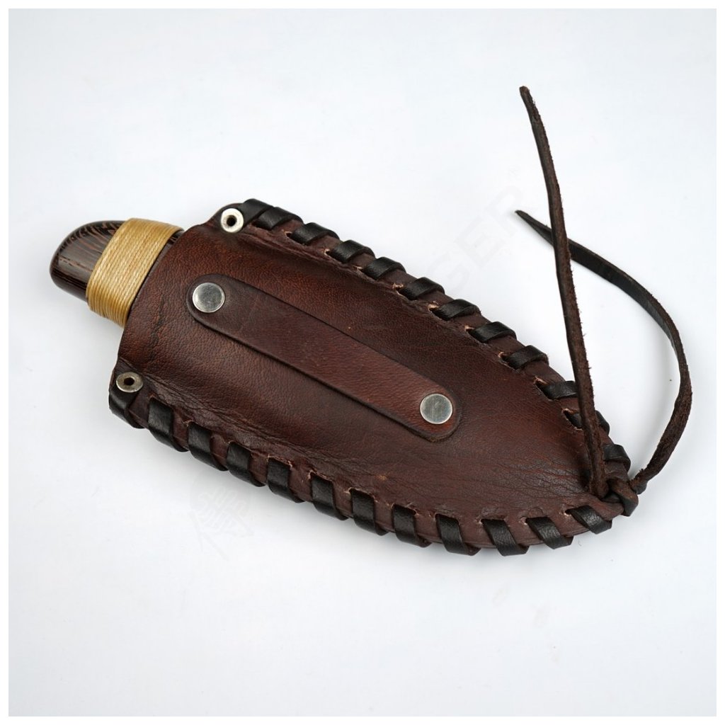 Nůž disponuje ergonomickou rukojetí z tmavého dřeva Wenge s autentickým omotem z konopného provazu. Tento praktický a netradiční outdoorový nůž poskytuje spolehlivý výkon při práci se dřevem i běžných úkonech v tábořišti. Nůž je dodávaný v koženém pouzdru z kvalitní hovězí kůže, které podtrhuje jeho přírodní charakter.