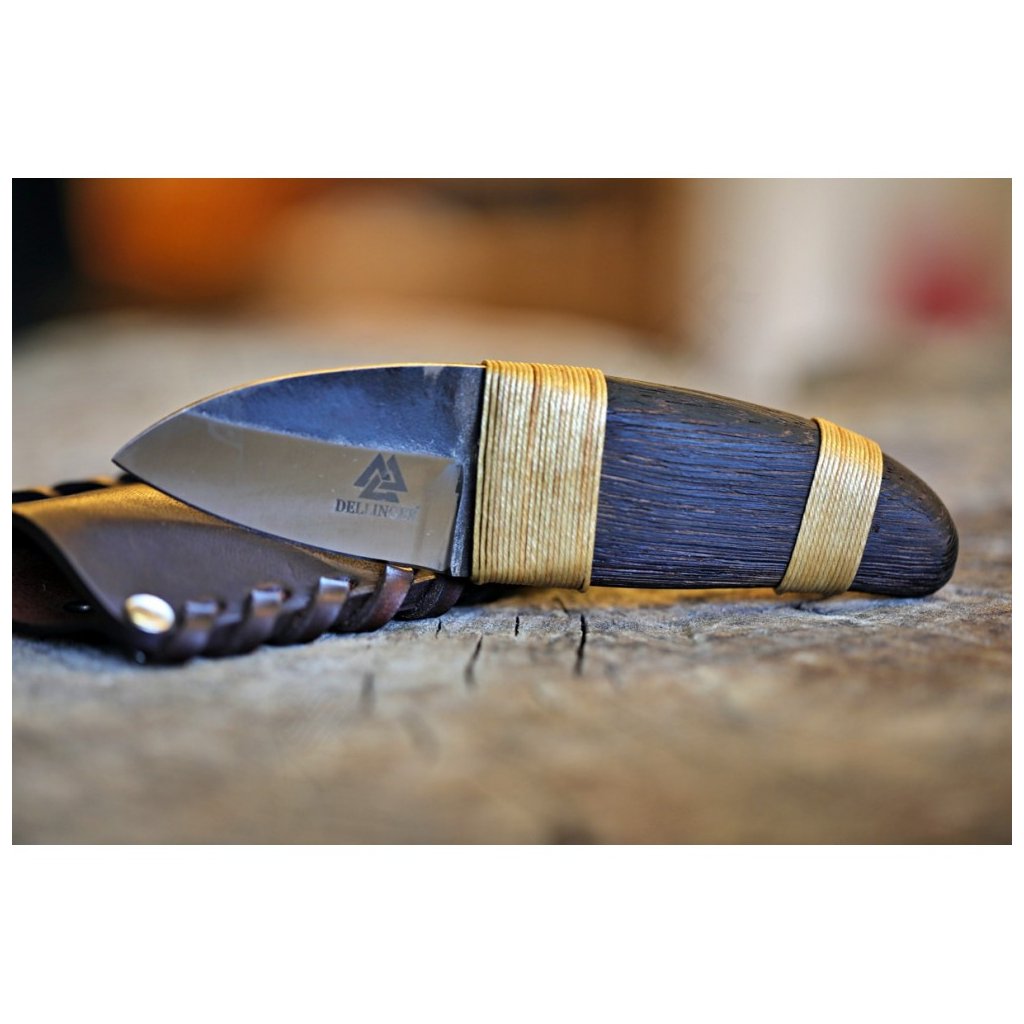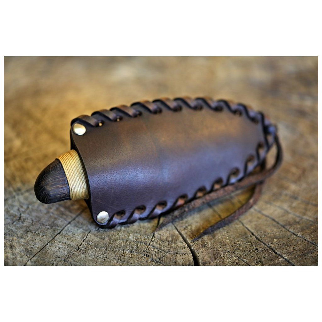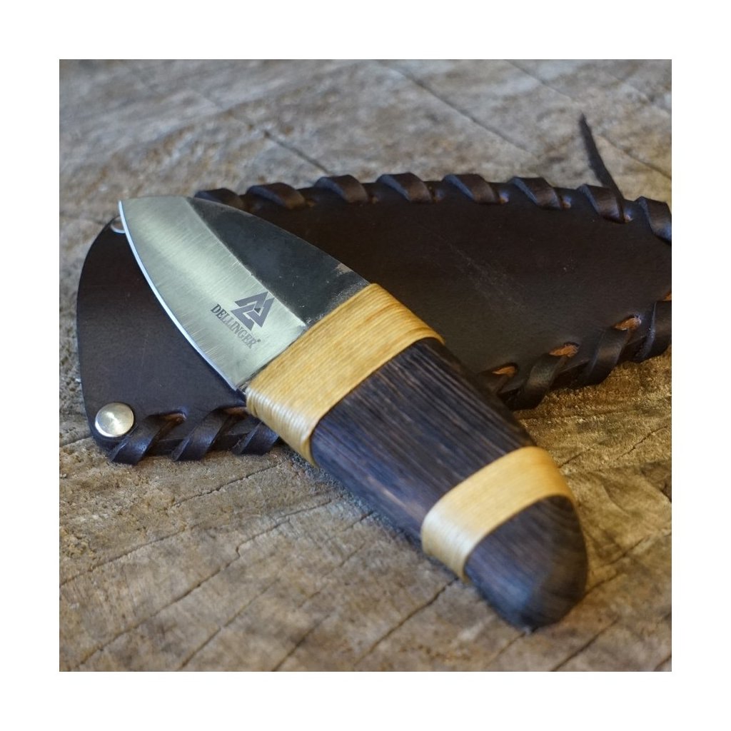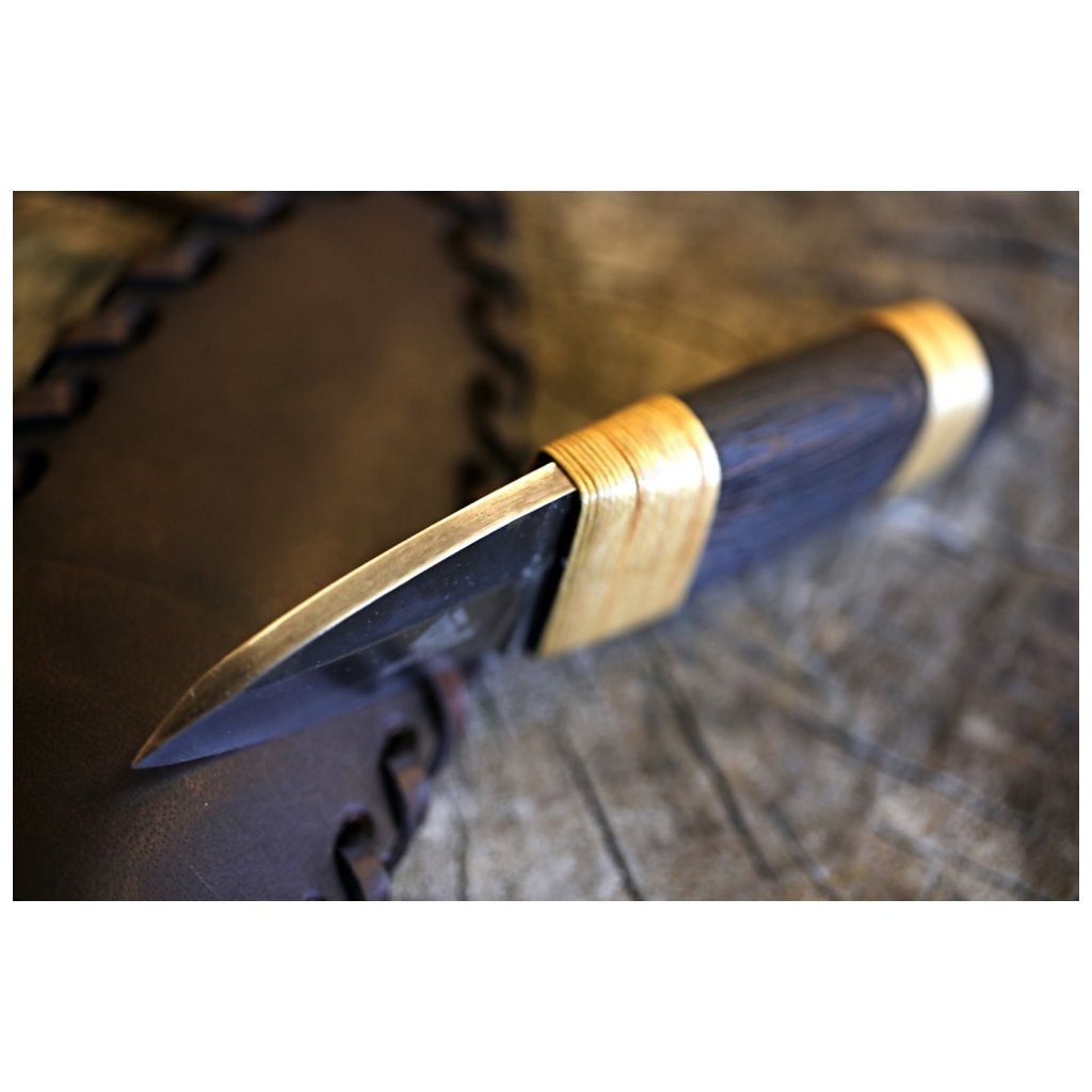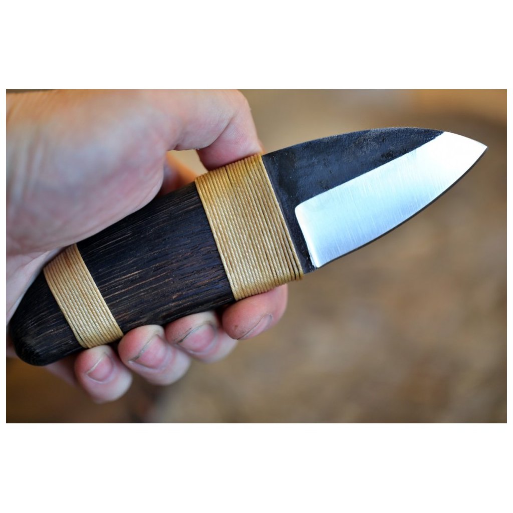 Nůž disponuje ergonomickou rukojetí z tmavého dřeva Wenge s autentickým omotem z konopného provazu. Tento praktický a netradiční outdoorový nůž poskytuje spolehlivý výkon při práci se dřevem i běžných úkonech v tábořišti. Nůž je dodávaný v koženém pouzdru z kvalitní hovězí kůže, které podtrhuje jeho přírodní charakter.