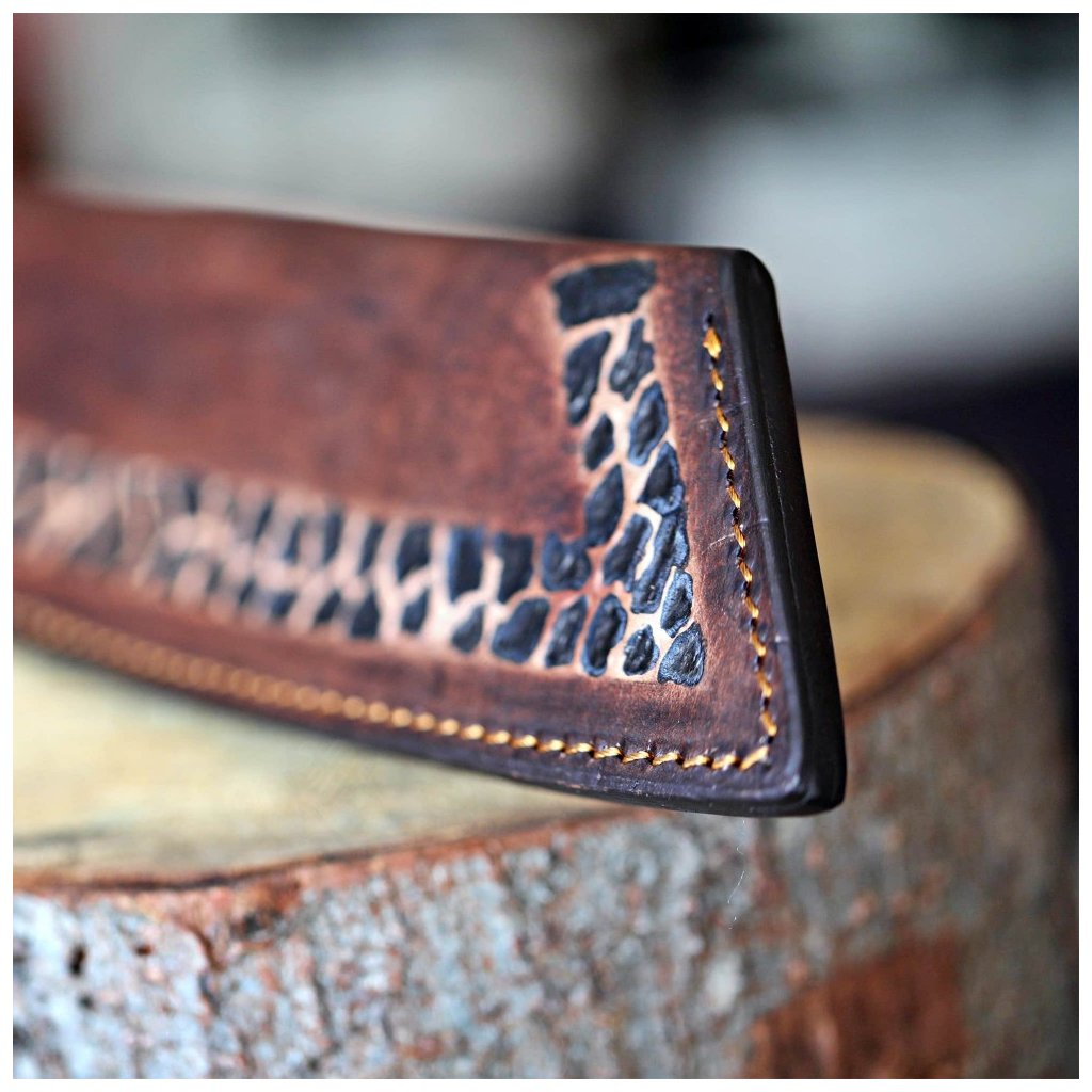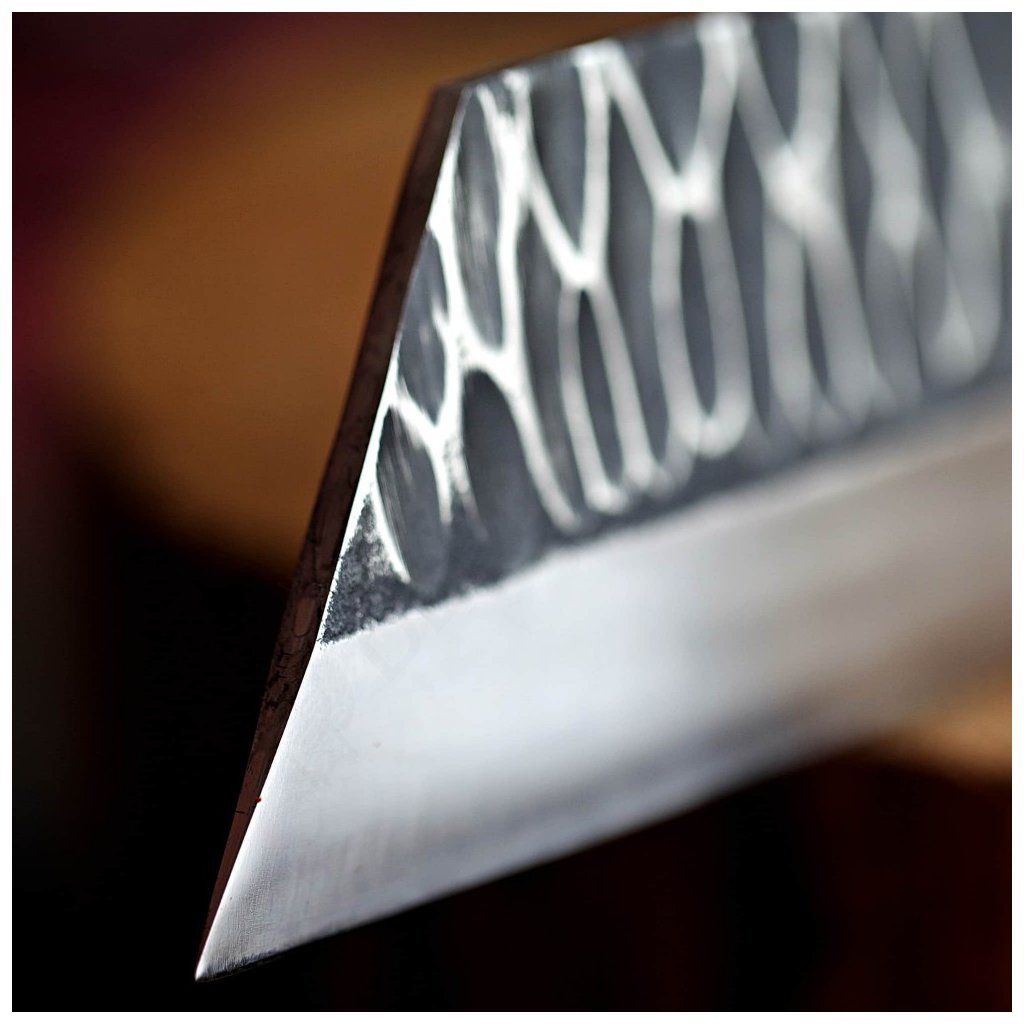 Pro udržení špičkového výkonu oceli D2 doporučujeme diamantové brusné kameny. Pokud si na broušení masivní čepele netroufáte, obraťte se na náš profesionální servis nebo navštivte naše kurzy broušení.