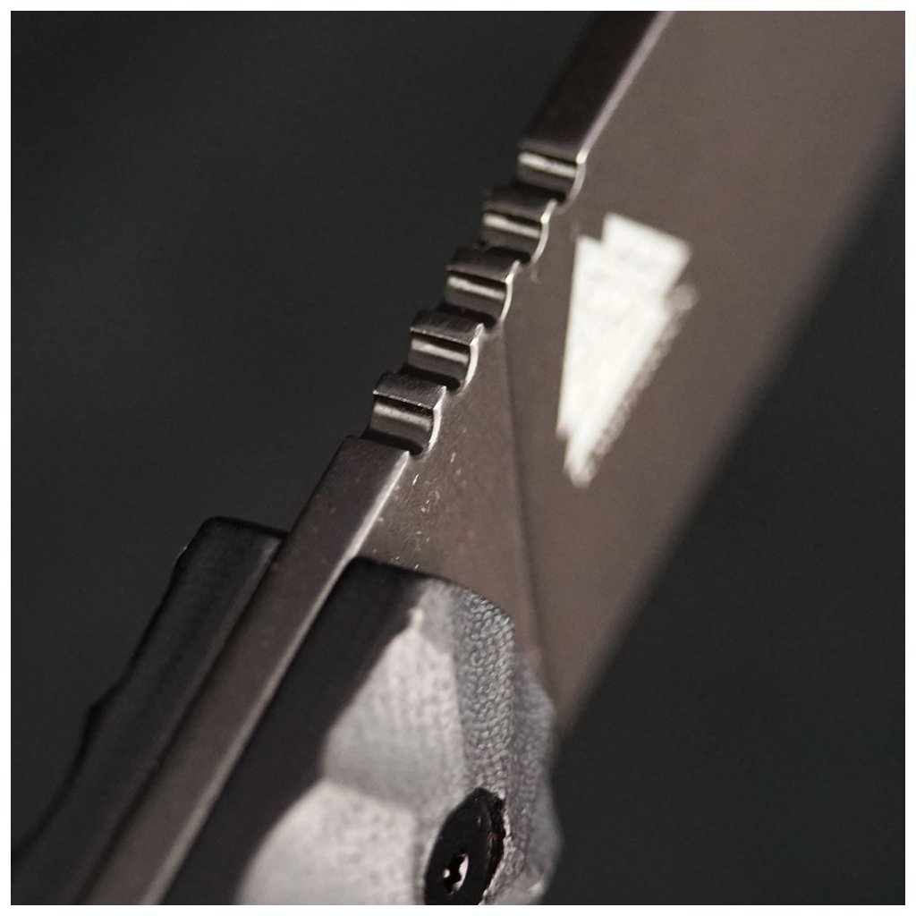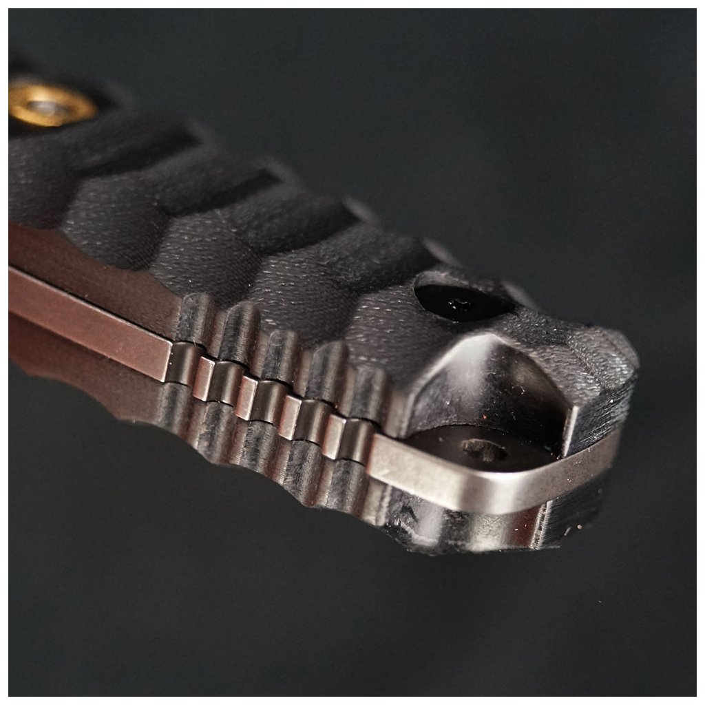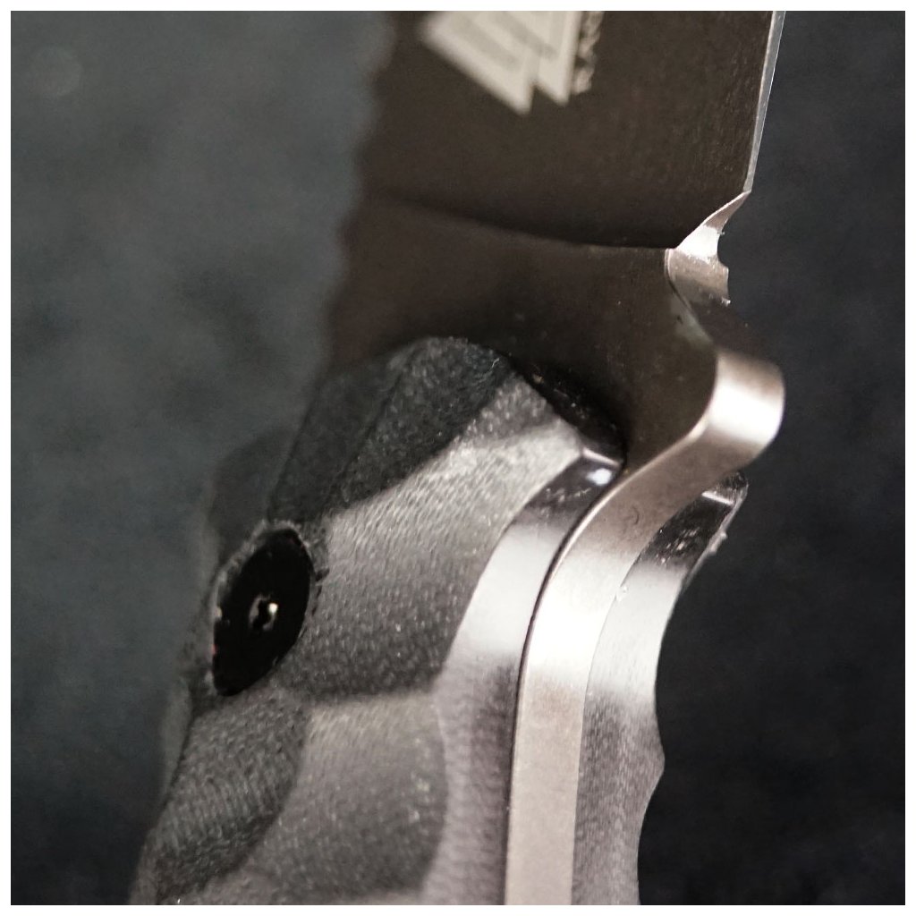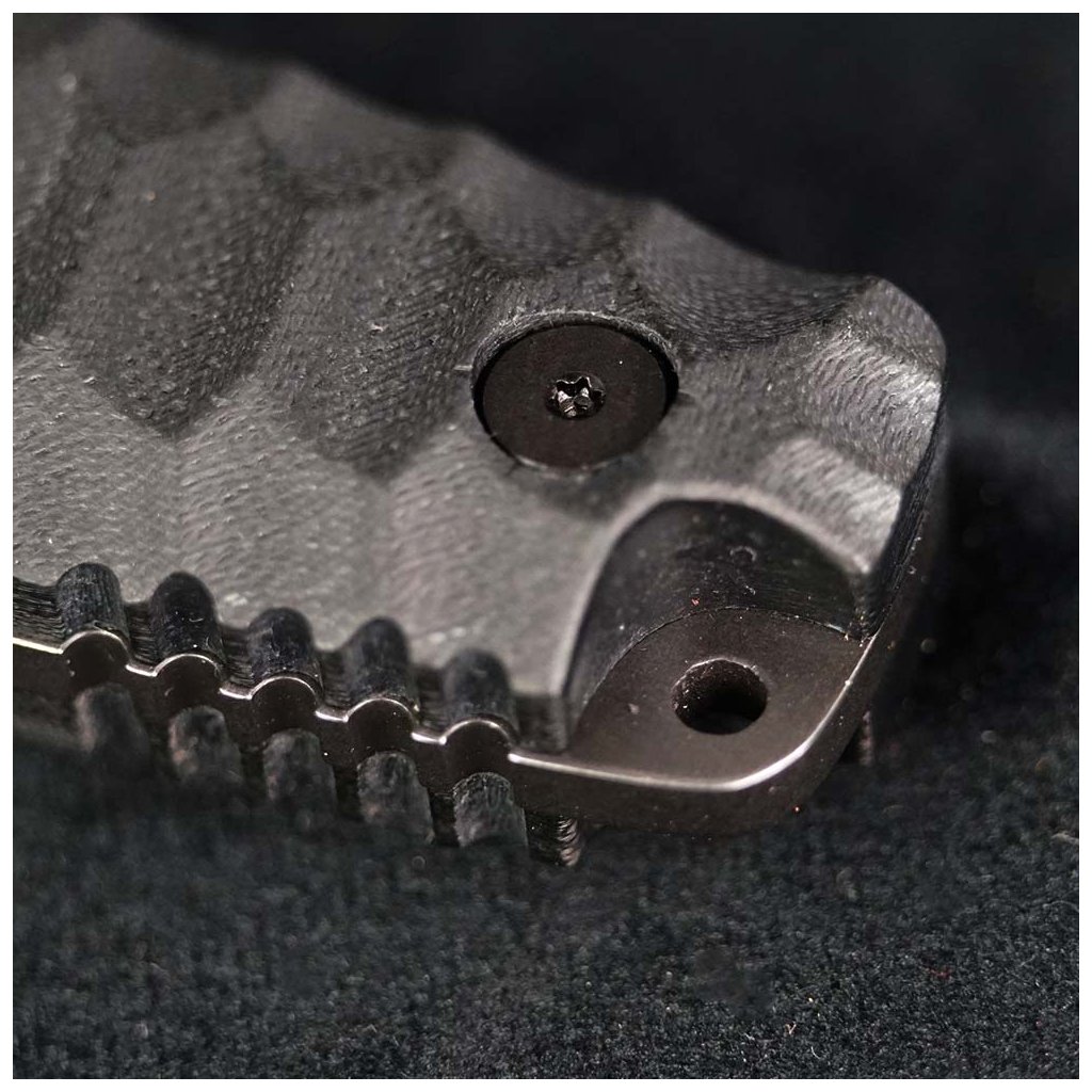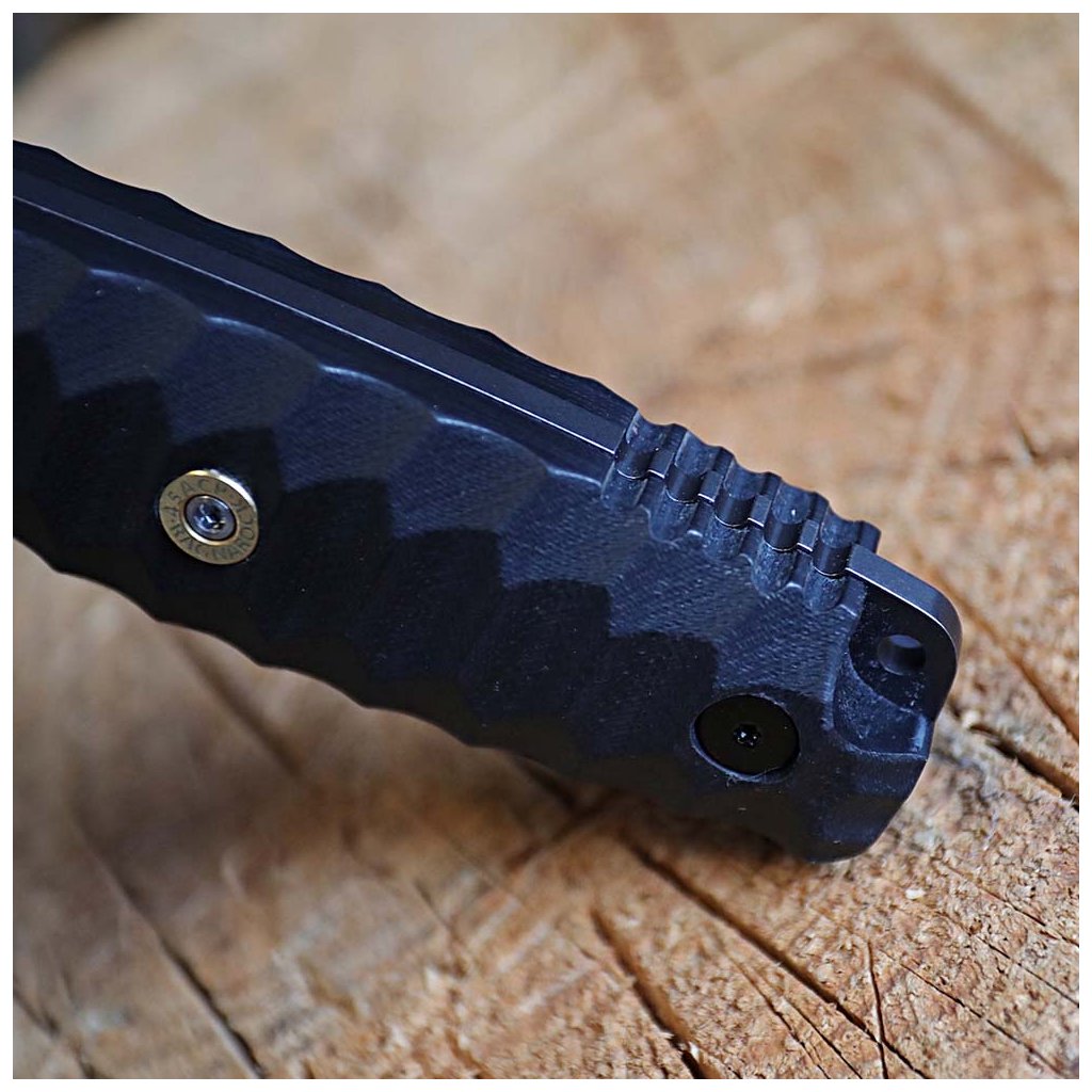 Rukojeť je vyrobena z vysoce odolného laminátu Micarta s texturou Obsidián. Tento materiál nepracuje, je odolný vůči vlhkosti, chemikáliím i teplotním výkyvům. Poskytuje pevný a stabilní úchop i v rukavicích nebo za deště.
