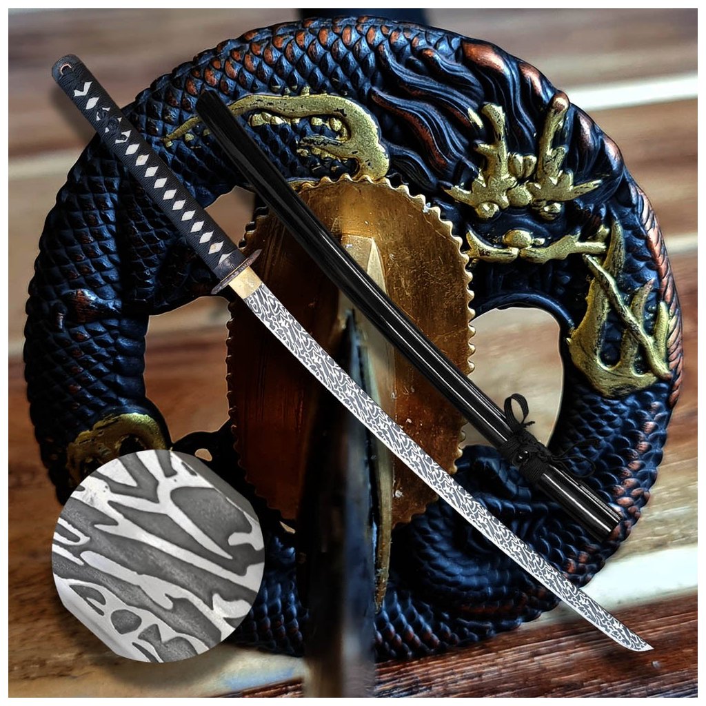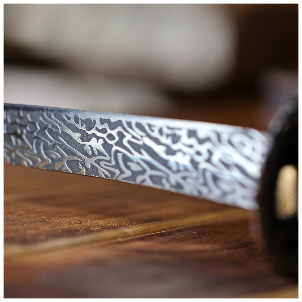 Tato kovaná replika katana typu shinogi-zukuri je vyrobena z prověřené uhlíkové oceli AISI 1045. Jako esteticky hodnotná replika meče katana v naší nabídce vyniká tento model vizuálně atraktivní 3D imitací damaškového vzoru na čepeli. Meč najde své uplatnění jako dekorace, ale je vhodný i pro aktivní nácvik technik bojových umění. Vzhledem k absenci parciálního kalení a tvrdosti 48 HRC je tato sportovní replika určena pro studium forem a pohybů, nikoliv pro sekání tvrdých materiálů. Robustní konstrukce s rukojetí potaženou pravou rejnočí kůží zajišťuje autentický pocit při manipulaci.