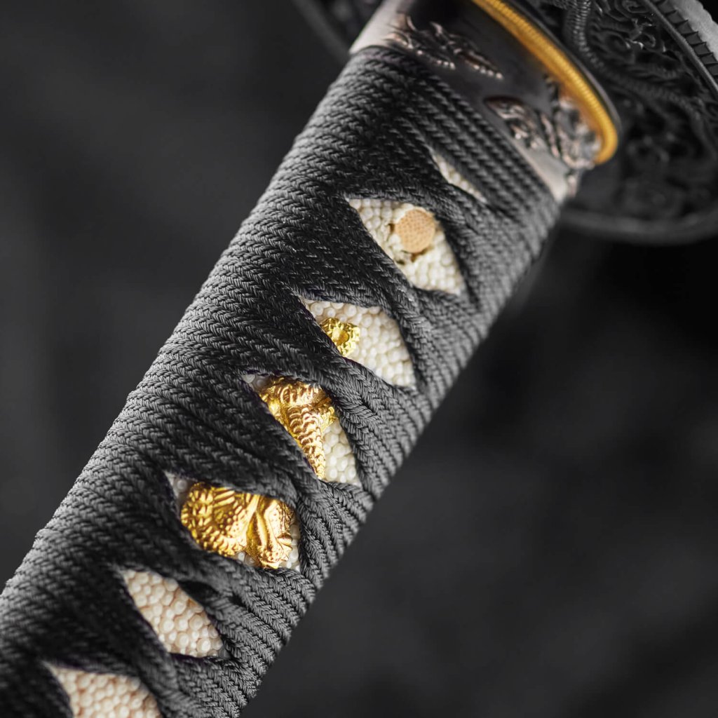 | Tsuka (rukojeť) | Dřevěné jádro, pravá černá rejnočí kůže, černý oplet Ito |