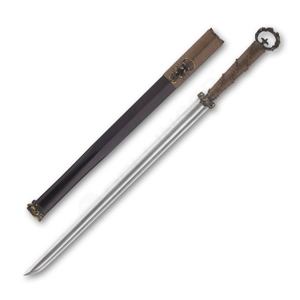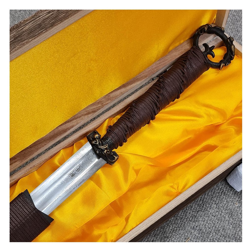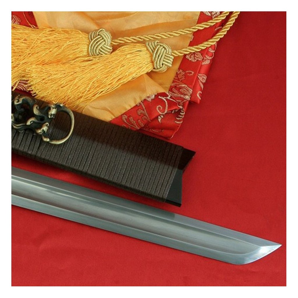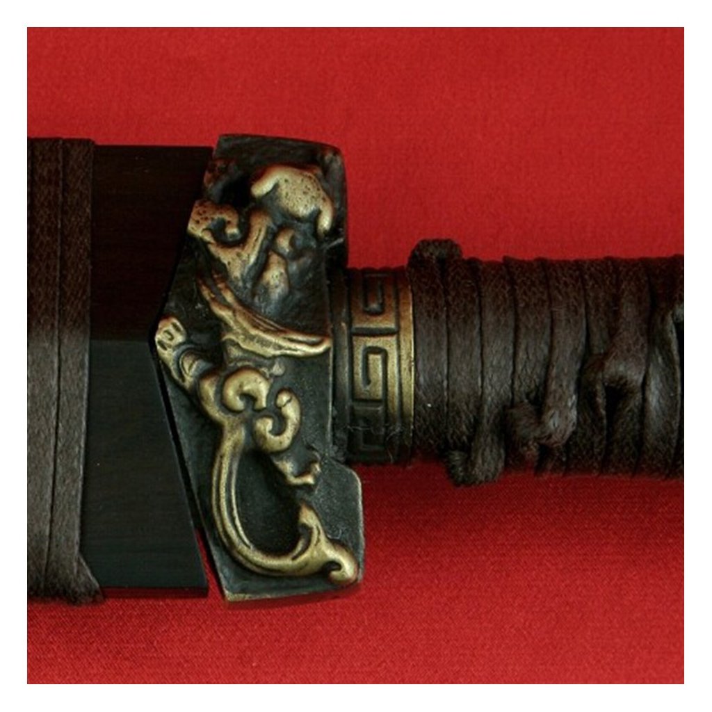 Objevte kouzlo dálnovýchodní historie s autentickou replikou šavle Han Dao. Tento model je vyroben z vysoce kvalitní překládané oceli AISI 1075, která dává čepeli charakteristickou texturu a vysokou odolnost. Design věrně následuje historické předlohy, včetně precizně zpracovaného odlehčovacího žlábku a dekorativní kovové záštity.