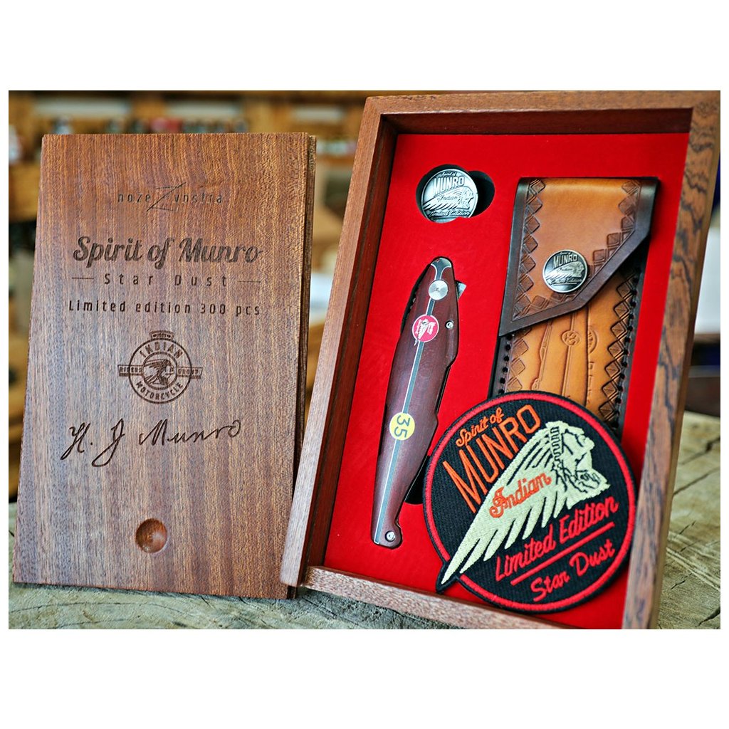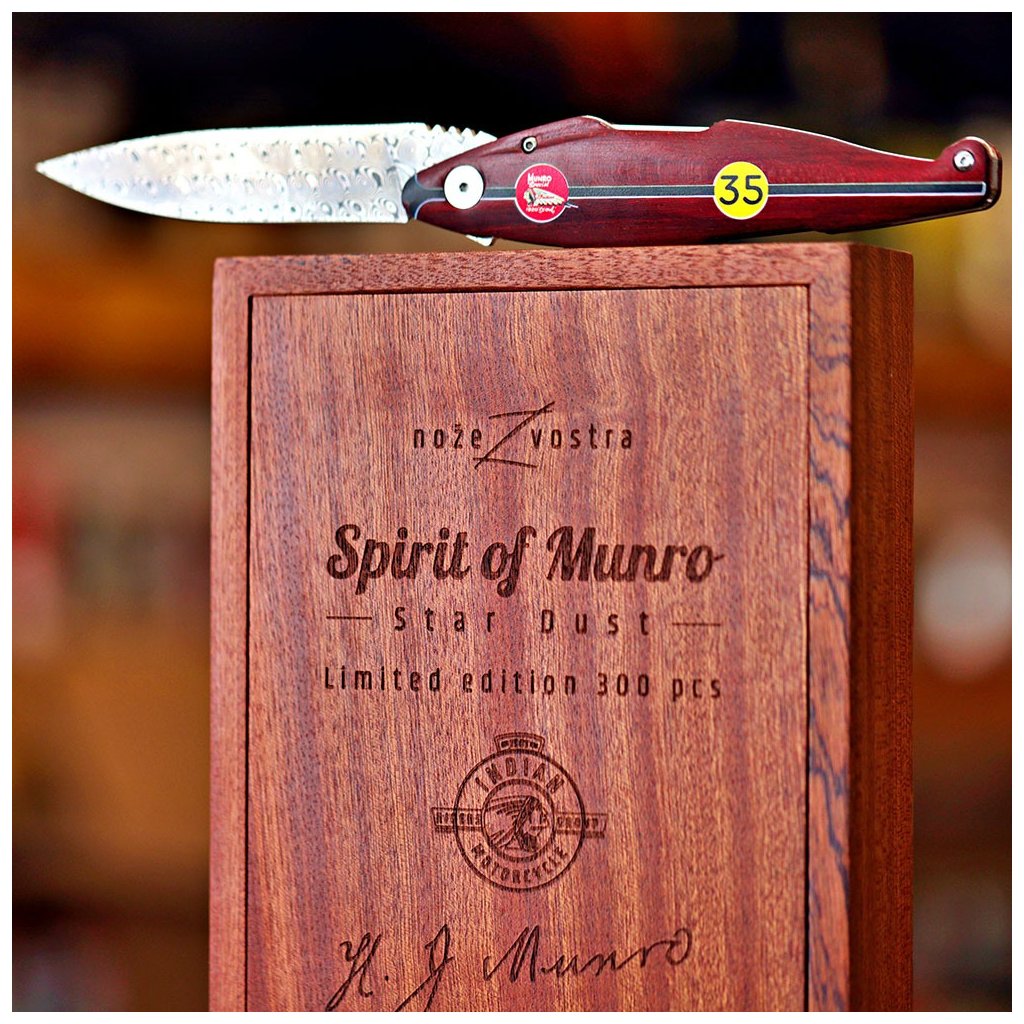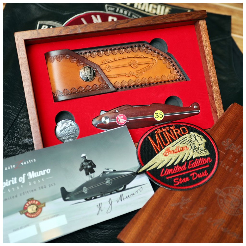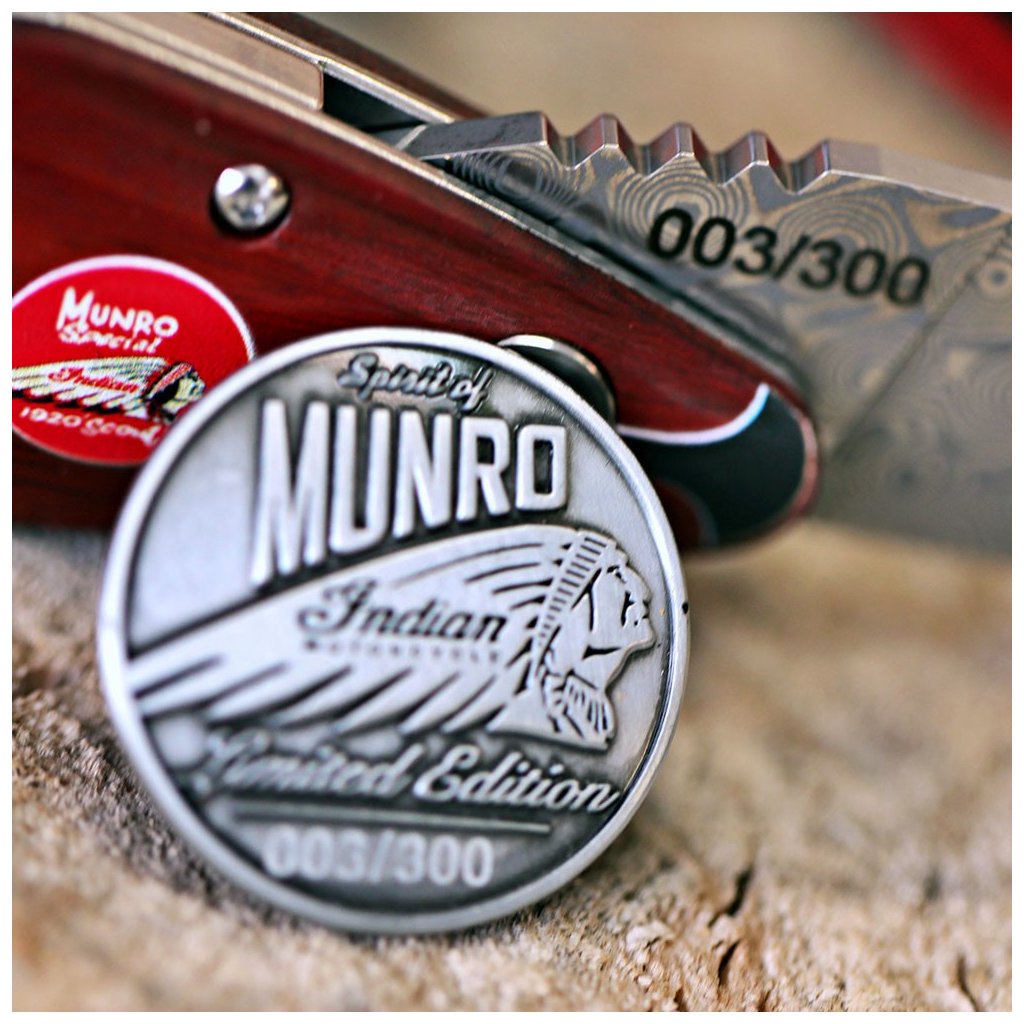 Díky spolupráci s Václavem Urbanem a laskavému svolení syna legendy, Johna Munroa, nese tento nůž oficiální prvky značky Indian a podpis samotného Burta. Čepel je vyrobena z unikátní damaškové nerezové oceli bez jádra a díky keramickým kuličkovým ložiskům vyniká neuvěřitelně hladkým chodem. Bezpečnost zajišťuje precizní liner lock. Rukojeť z ušlechtilého červeného dřeva Redwood zdobí ikonické startovní číslo 35.