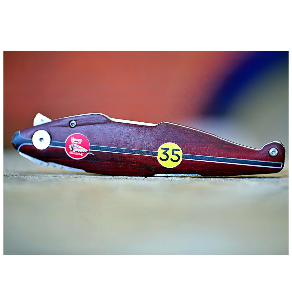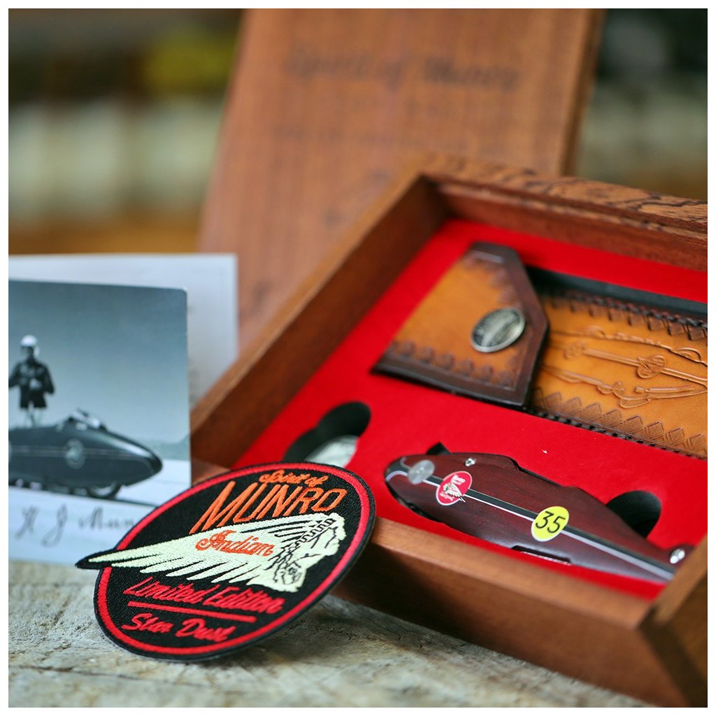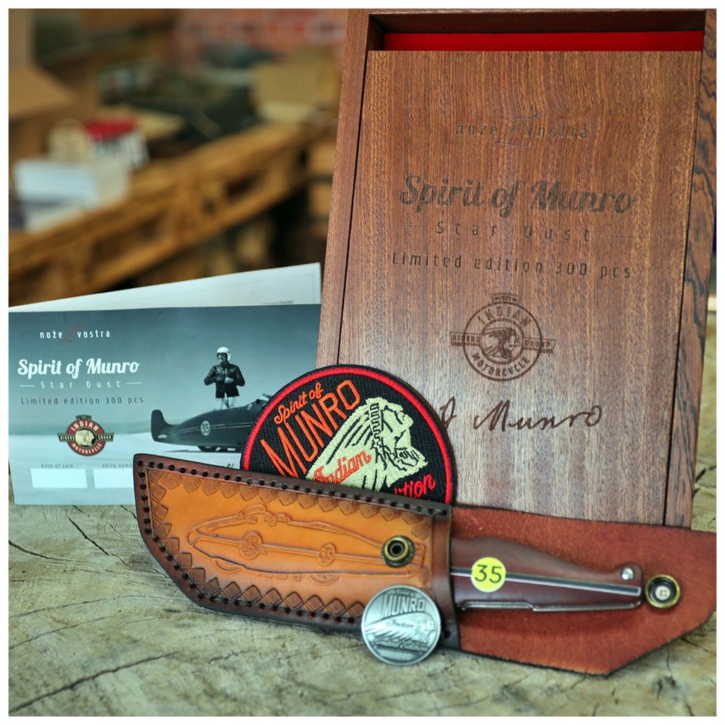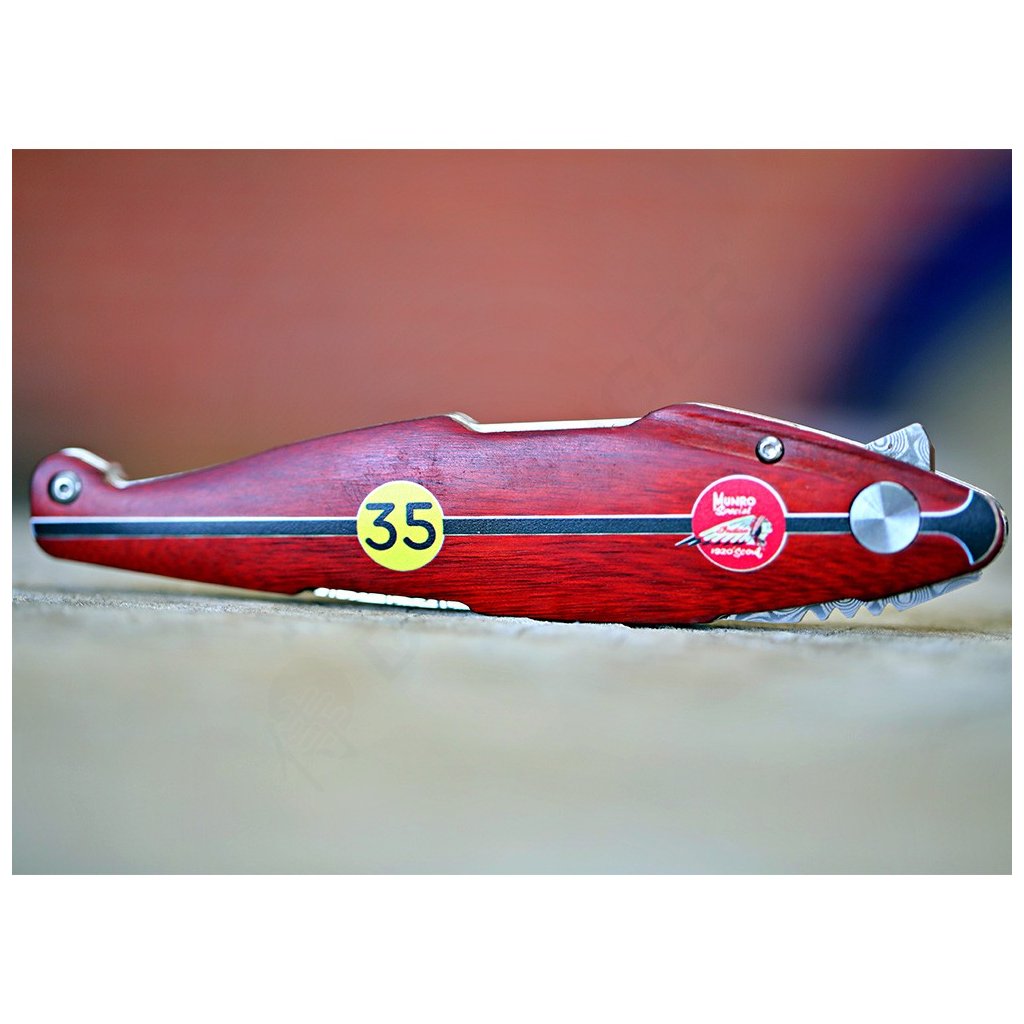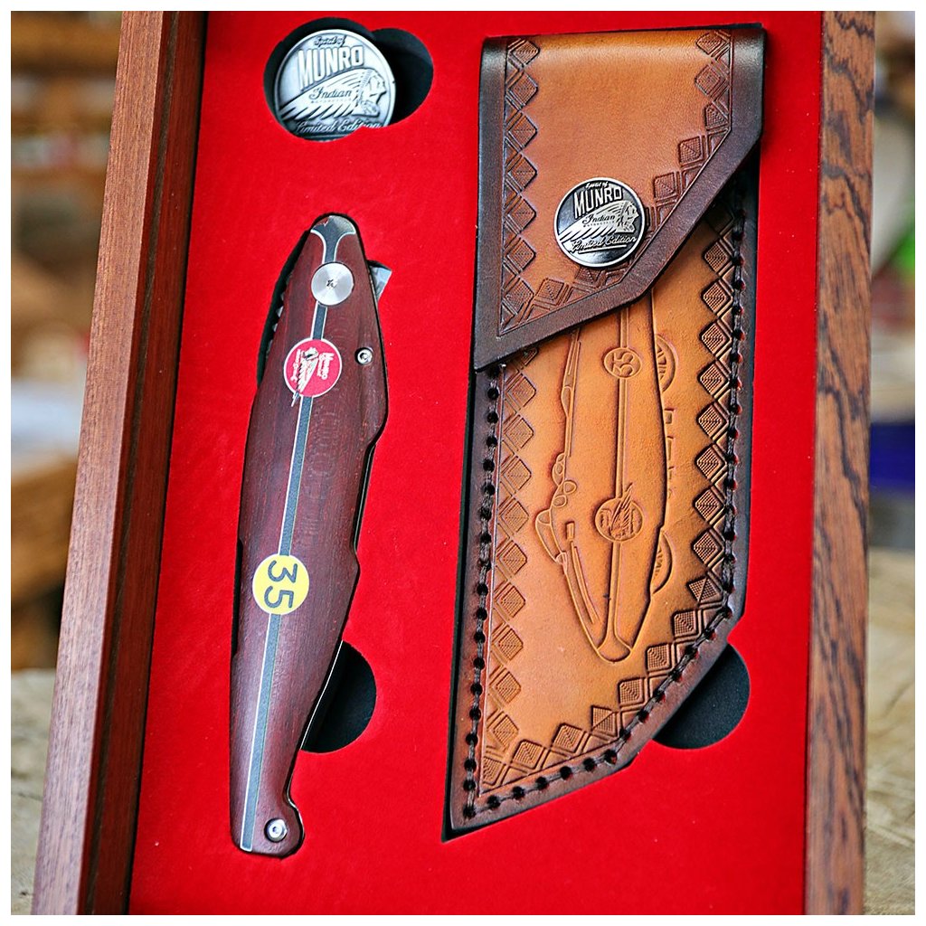 Díky spolupráci s Václavem Urbanem a laskavému svolení syna legendy, Johna Munroa, nese tento nůž oficiální prvky značky Indian a podpis samotného Burta. Čepel je vyrobena z unikátní damaškové nerezové oceli bez jádra a díky keramickým kuličkovým ložiskům vyniká neuvěřitelně hladkým chodem. Bezpečnost zajišťuje precizní liner lock. Rukojeť z ušlechtilého červeného dřeva Redwood zdobí ikonické startovní číslo 35.