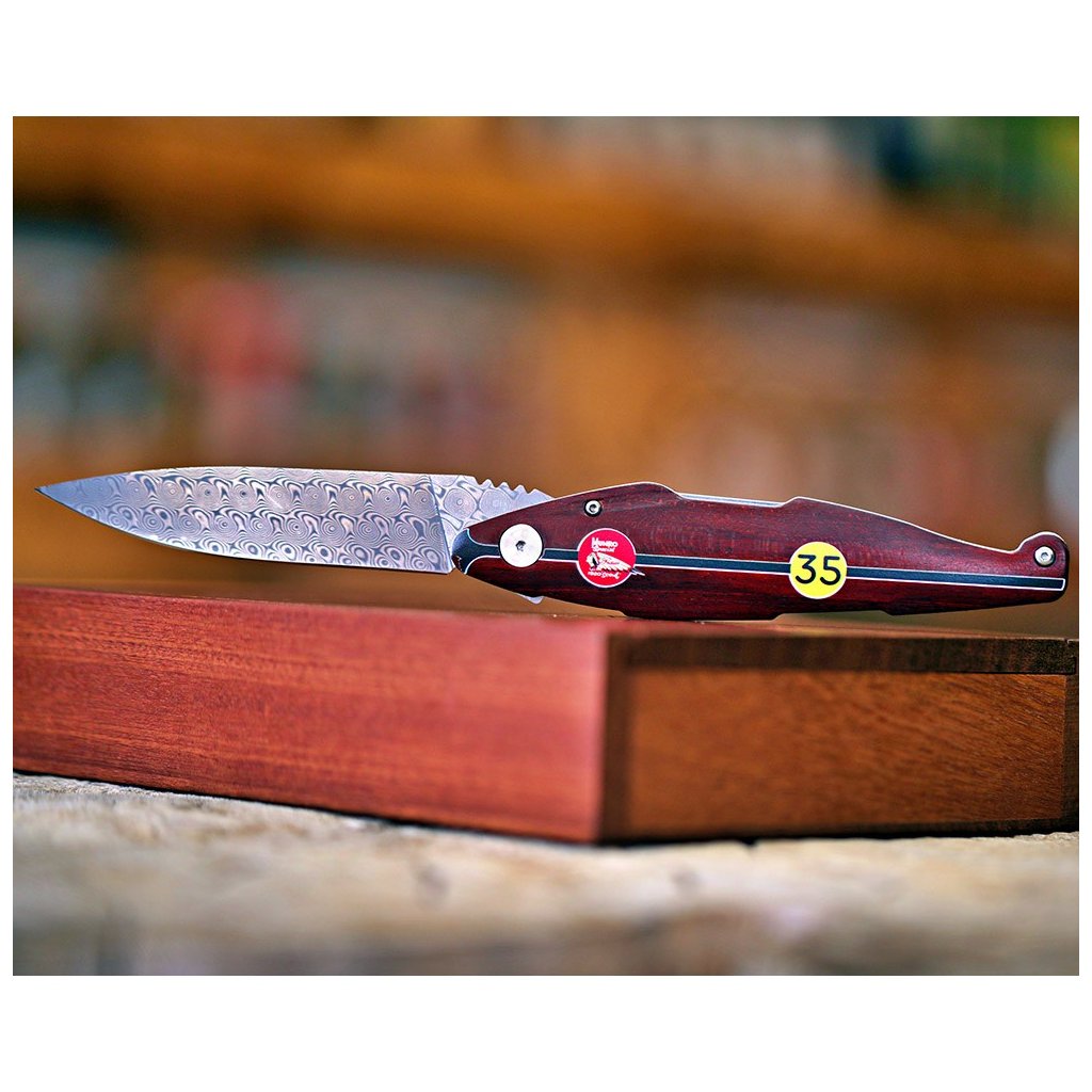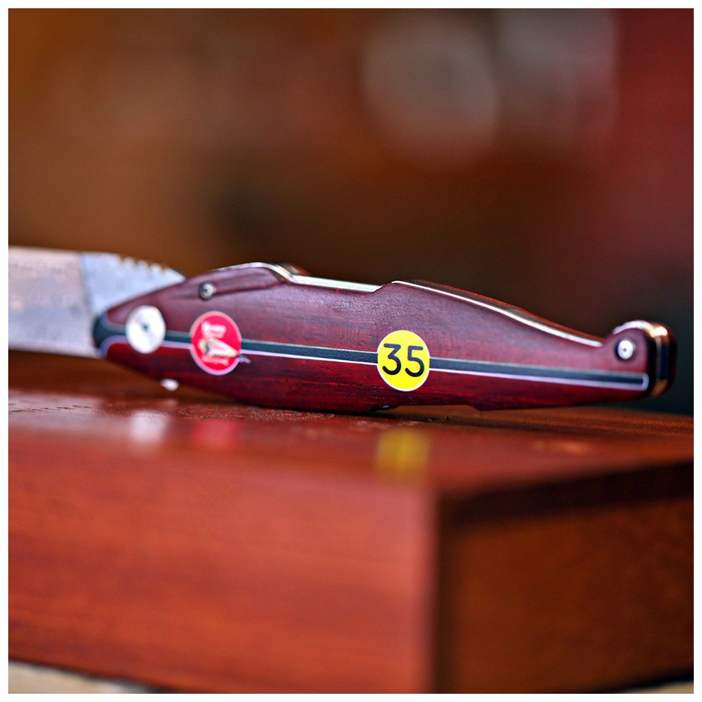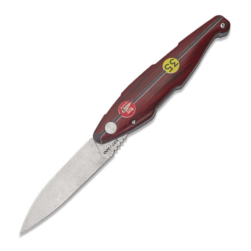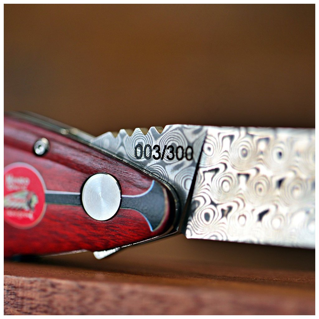 Díky spolupráci s Václavem Urbanem a laskavému svolení syna legendy, Johna Munroa, nese tento nůž oficiální prvky značky Indian a podpis samotného Burta. Čepel je vyrobena z unikátní damaškové nerezové oceli bez jádra a díky keramickým kuličkovým ložiskům vyniká neuvěřitelně hladkým chodem. Bezpečnost zajišťuje precizní liner lock. Rukojeť z ušlechtilého červeného dřeva Redwood zdobí ikonické startovní číslo 35.