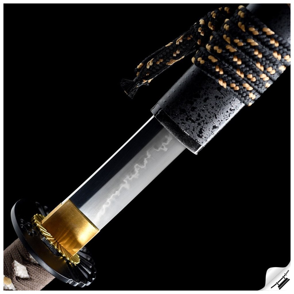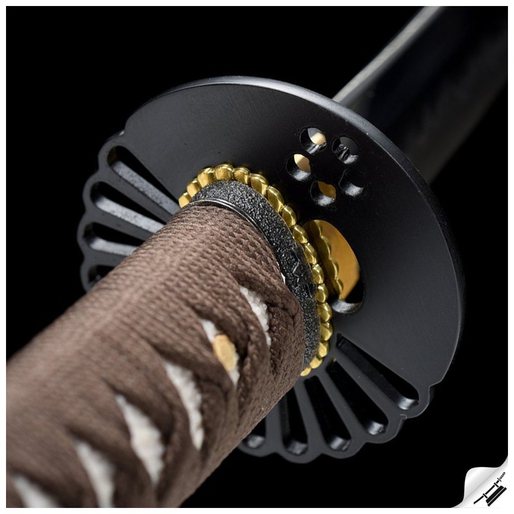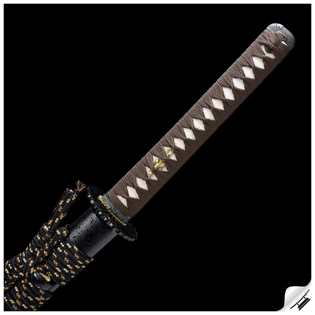 ✅ Tsuka: (rukojeť) dřevěné jádro, potažena pravou rejnočí kůží (Samegawa), s hedvábnou hnědou omotávkou ITO. Čepel zajištěna 2 kolíky "mekugi"
