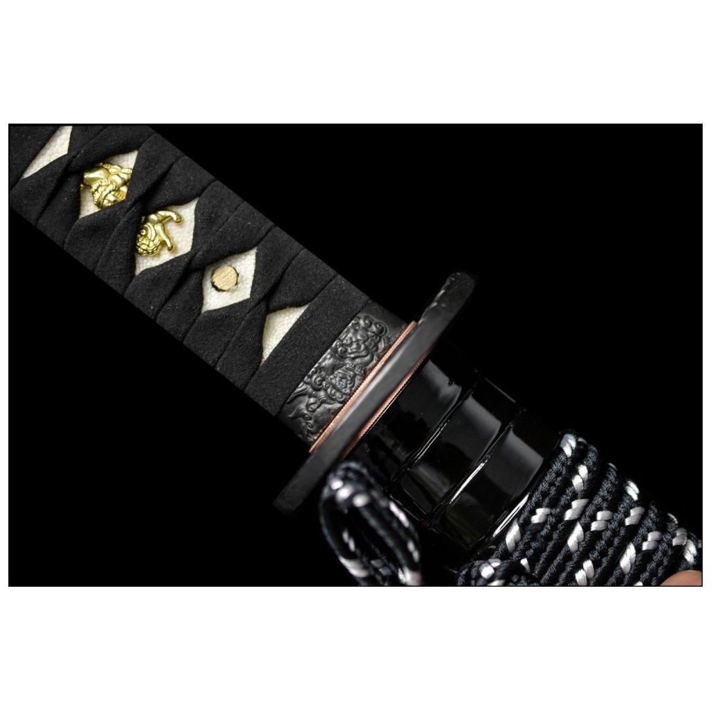 • Tsuka (rukojeť) - dřevěné jádro obalené pravou kůží z rejnoka (Samegawa) s černou semišovou kůží Ito Wrapped. Čepel katany je zajištěna dvěma mekugi (kolíky). Čepel od rukojeti můžete odmontovat vytažením těchto kolíků. Na každé straně Tsuky je zlatý pes Fu (ornament).