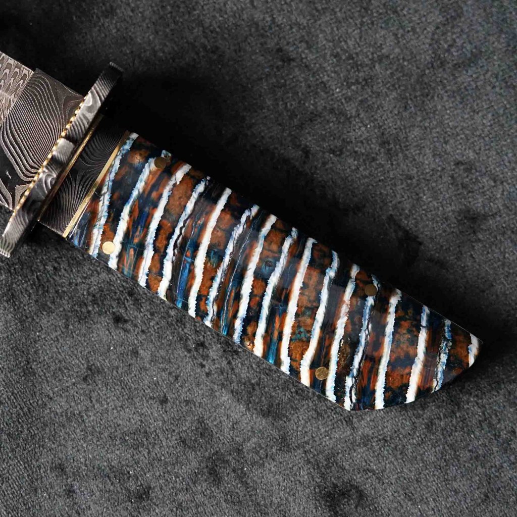 Unikátní nůž Tanto Dellinger FEZÁ Braun nr. 2, mamutí fosilie, Feather Damascus