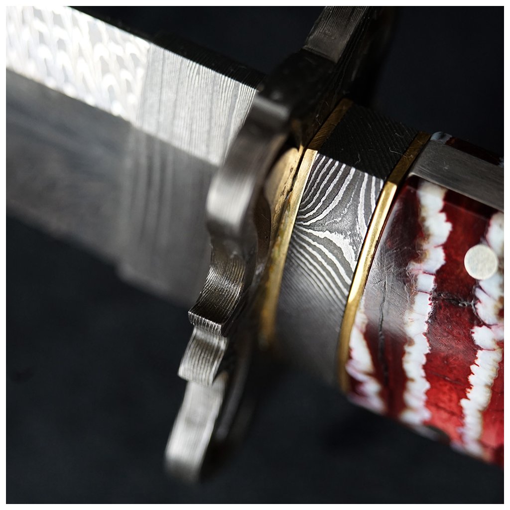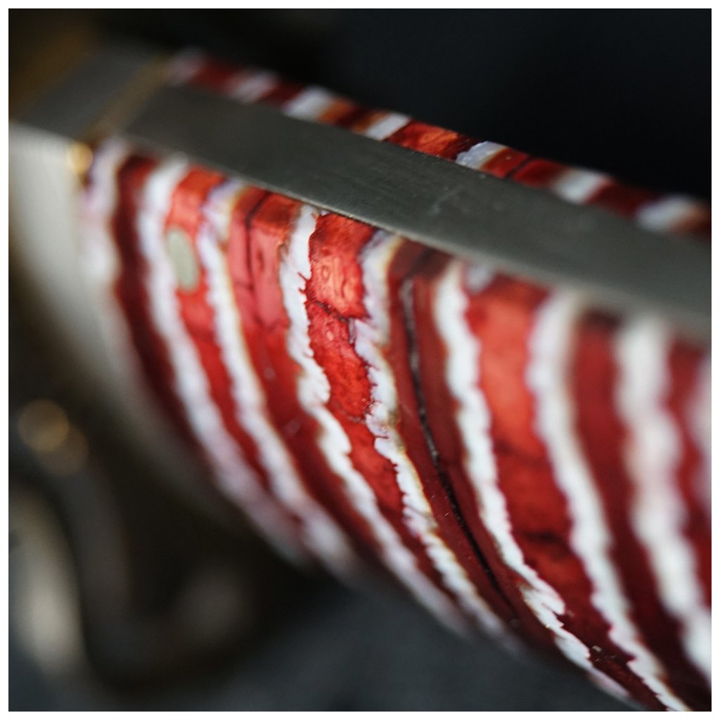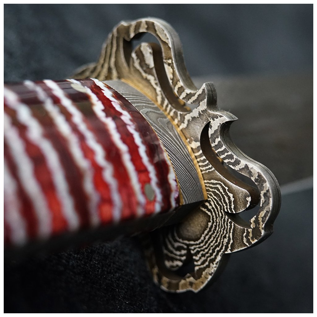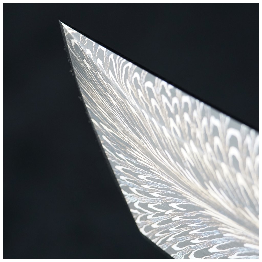 Model Tanto Dellinger FEZÁ Violet představuje spojení pravěké historie a špičkové moderní metalurgie. Čepel je ručně vykována z americké damaškové oceli Randy Feather Damascus, která je celosvětově uznávána pro svůj precizní vzor připomínající ptačí pírka. Každý nůž prochází individuálním procesem ručního broušení pro dosažení maximální řezné schopnosti. Střenka (tsuka) je vyrobena z drahocenné fosílie mamutího zubu, zatímco záštita (tsuba) a habaki jsou rovněž z damašku. Tato kombinace vytváří esteticky dokonalý pár. Více než 10 000 let starý materiál byl nalezen v permafrostu na Sibiři. Dotykem rukojeti se doslova propojujete s historií legendárních tvorů z úsvitu lidstva.