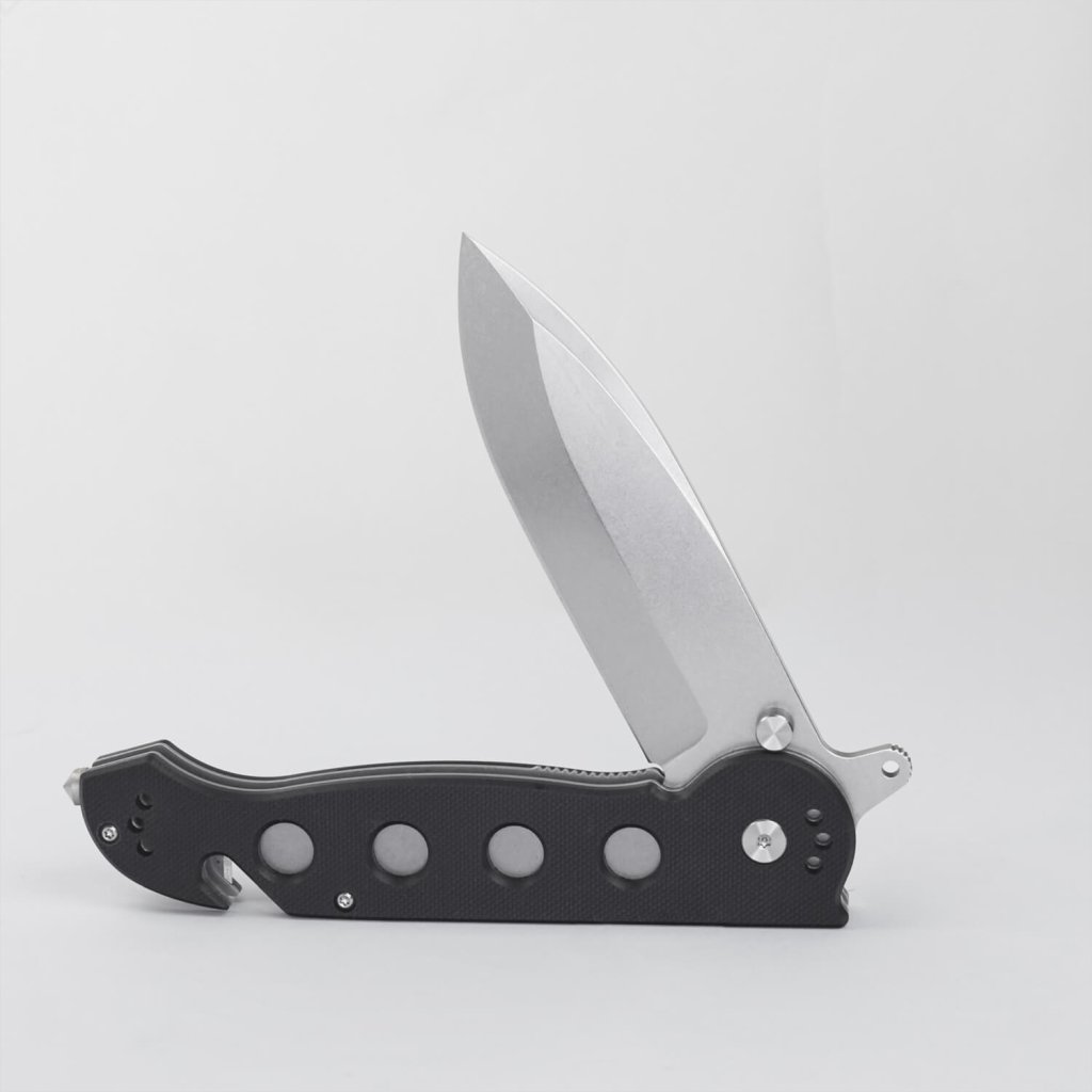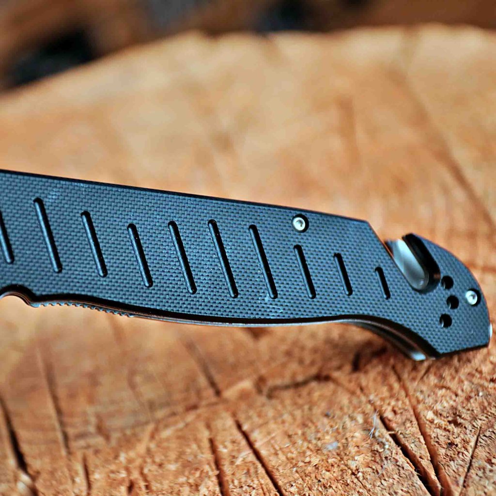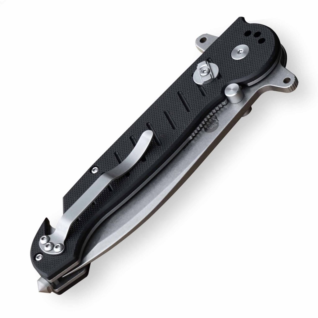 Rukojeť z černé G10 (extrémně odolný kompozit) je doplněna čtyřstranným klipem pro variabilní zavěšení, díky čemuž je nůž vhodný pro praváky i leváky. Bezpečnost zajišťuje pojistka typu Liner Lock s přídavným mechanismem proti nechtěnému zavření, což dává nástroji stabilitu srovnatelnou s noži s pevnou čepelí. Integrovaný rozbíječ skla ze slitiny wolframu a kobaltu (YG8 ALLOY) a řezač bezpečnostních pásů či provazů činí z tohoto modelu nepostradatelný záchranářský nástroj. Pohodlné jednoruční otevírání a výrazná záštita poskytují maximální jistotu úchopu a bezpečnost při práci.