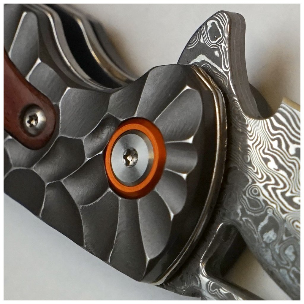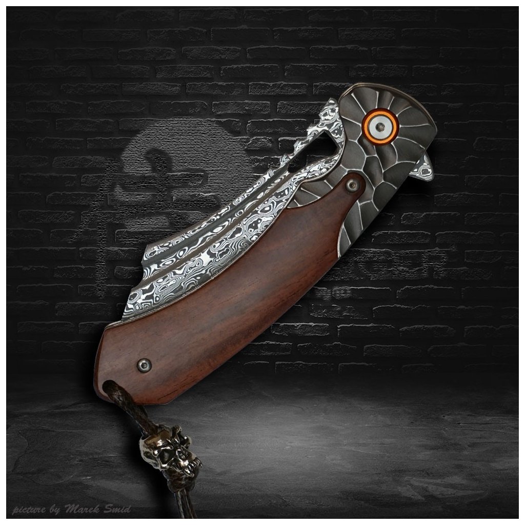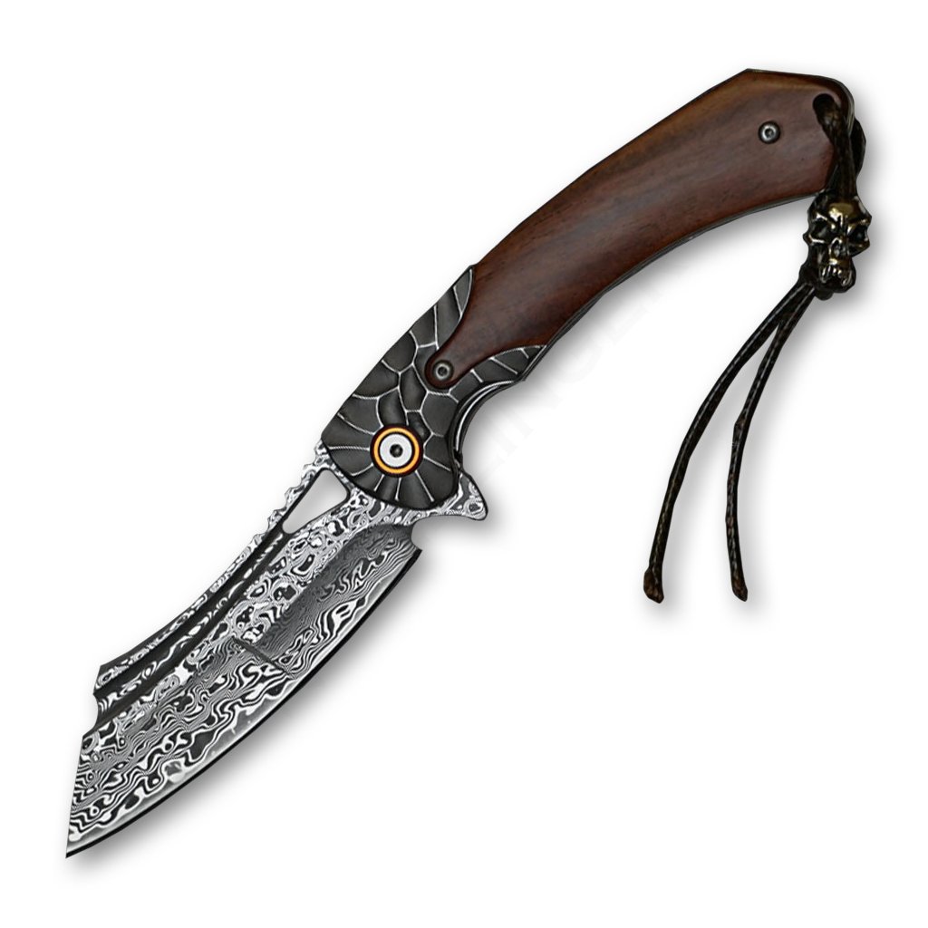 Zavírací nůž Dellinger Rock s čepelí typu tanto disponuje řezným jádrem z damaškové oceli VG-10, které je chráněno 66 vrstvami nerezového damašku. Tato konstrukce zajišťuje tvrdost kolem 61 HRC a špičkovou dlouhotrvající ostrost. Estetika damaškové oceli s jejím nezaměnitelným vzorem působí velmi impozantně. Nůž patří do oblíbené kategorie EDC, takže je ideálním společníkem pro každodenní nošení. Mechanika čepele je uložena na kuličkových ložiscích, díky kterým je otevírání bleskové a plynulé. Bezpečnost zajišťuje osvědčená pojistka liner lock. Rukojeť z exotického palisandru sisso wood doplňuje masivní kování v unikátním dekoru obsidián. Palisandr vyniká svou hloubkou barev, tvrdostí a tvarovou stabilitou. Elegantním detailem je oranžový kroužek z titanu a paracord zakončený dekorativní lebkou. Součástí balení je pouzdro z poctivé kůže.