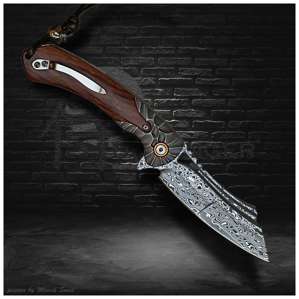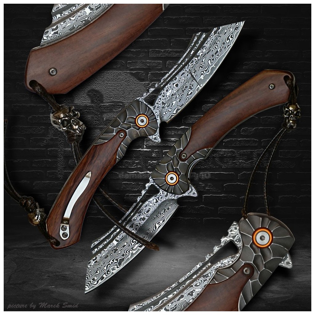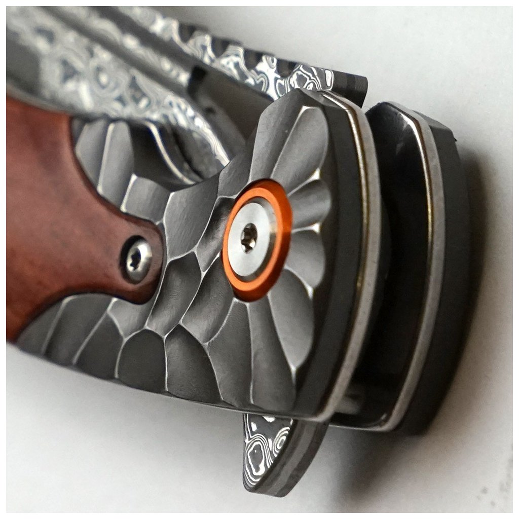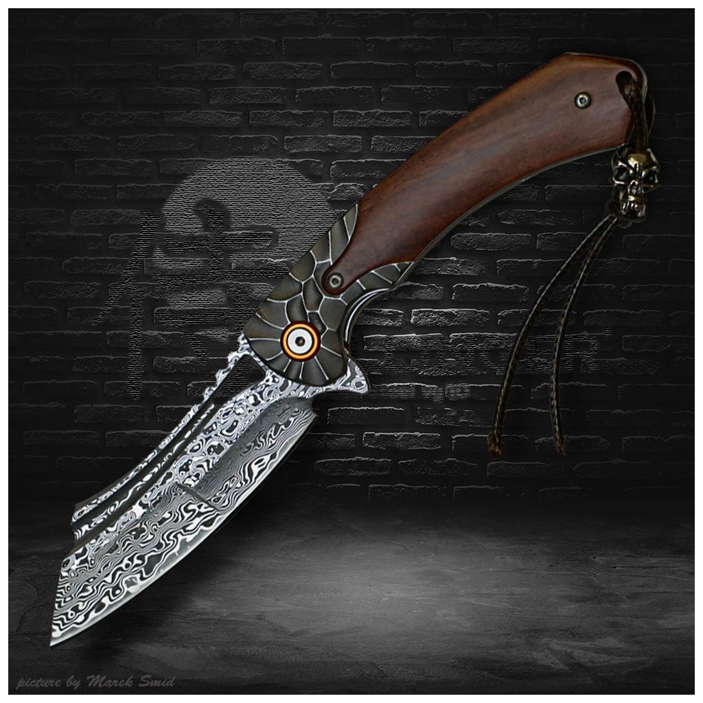 Zavírací nůž Dellinger Rock s čepelí typu tanto disponuje řezným jádrem z damaškové oceli VG-10, které je chráněno 66 vrstvami nerezového damašku. Tato konstrukce zajišťuje tvrdost kolem 61 HRC a špičkovou dlouhotrvající ostrost. Estetika damaškové oceli s jejím nezaměnitelným vzorem působí velmi impozantně. Nůž patří do oblíbené kategorie EDC, takže je ideálním společníkem pro každodenní nošení. Mechanika čepele je uložena na kuličkových ložiscích, díky kterým je otevírání bleskové a plynulé. Bezpečnost zajišťuje osvědčená pojistka liner lock. Rukojeť z exotického palisandru sisso wood doplňuje masivní kování v unikátním dekoru obsidián. Palisandr vyniká svou hloubkou barev, tvrdostí a tvarovou stabilitou. Elegantním detailem je oranžový kroužek z titanu a paracord zakončený dekorativní lebkou. Součástí balení je pouzdro z poctivé kůže.