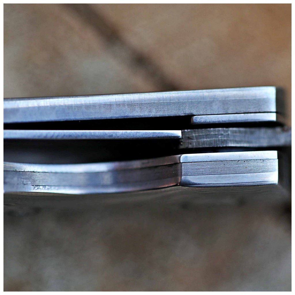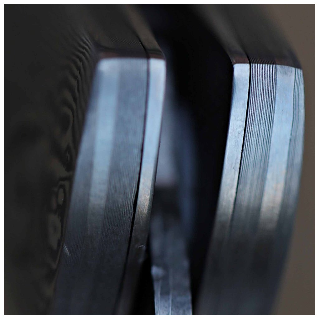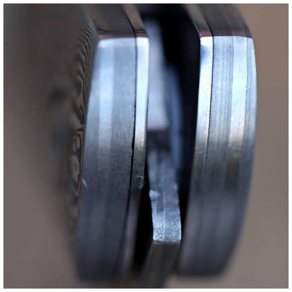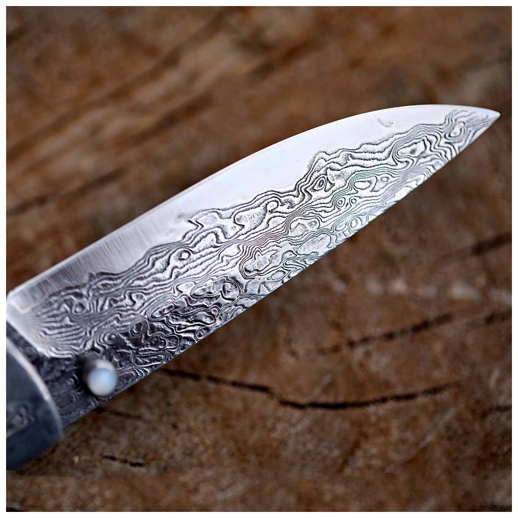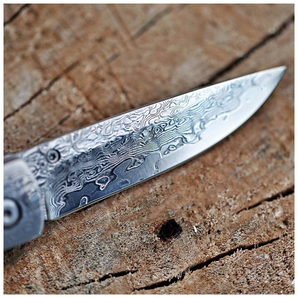 Čepel zavíracího nože Dellinger Weidmann je mistrovským dílem metalurgie. Řezné jádro z vysoce kvalitní japonské oceli VG-10 je vloženo mezi 66 vrstev dvou nerezových damaškových ocelí, což vytváří nezaměnitelnou kresbu. Ocel dosahuje tvrdosti 60 HRC, vyniká odolností proti korozi a dlouhou stabilitou ostří. Pro bleskové otevírání je čepel uložena v kuličkových ložiskách a bezpečí zajišťuje spolehlivá pojistka liner lock.