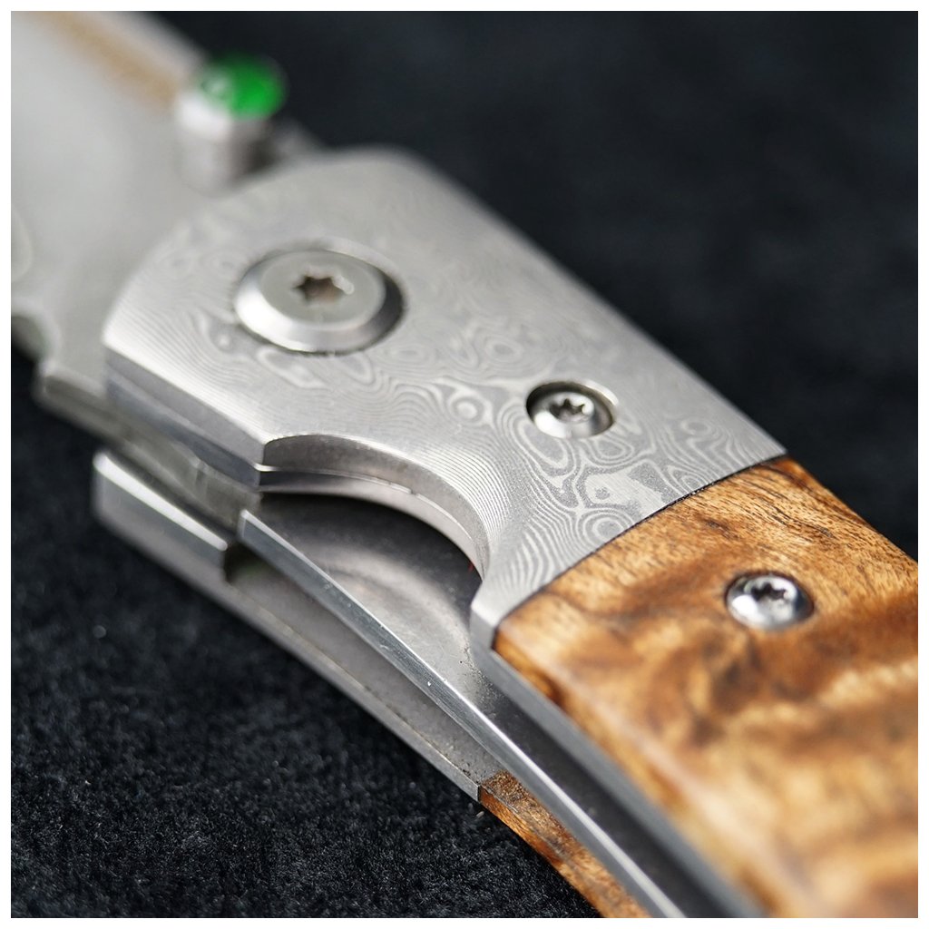 Mechanika nože je na nejvyšší úrovni – čepel je uložena v keramických kuličkových ložiscích, což ve spojení s flipperem zajišťuje plynulý chod bez jakéhokoliv odporu. Rukojeť z javorové kořenice (Maple Burl) nabízí jeden z nejkrásnějších přírodních vzorů. "Burl" je výrůstek na stromě, který vytváří divokou, propletenou texturu dřeva, díky níž je každý nůž neopakovatelným originálem. Bezpečnost při práci zajišťuje osvědčená pojistka liner lock.