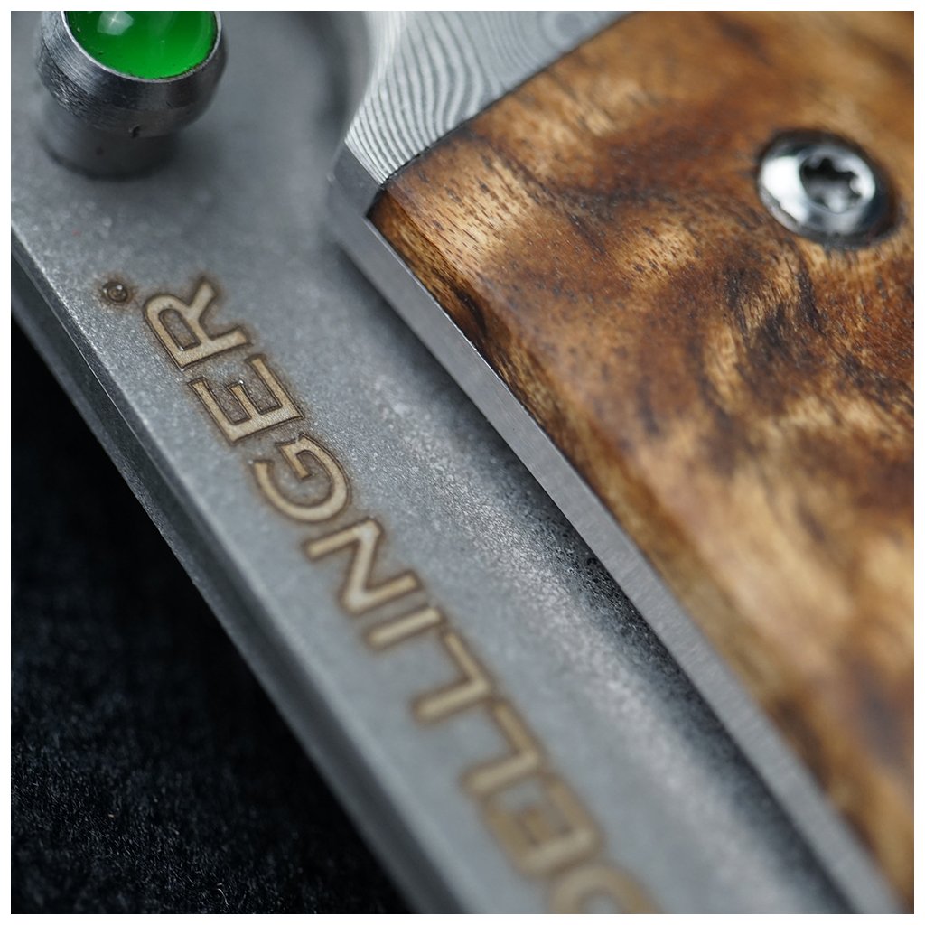 Zavírací nůž Dellinger Scorpion Maple Burlwood je navržen pro ty, kteří ocení technickou dokonalost v esteticky podmanivém balení. Čepel je vyrobena tradiční technikou San Mai, kde je extrémně tvrdé řezné jádro z nerezové oceli SKD11 chráněno dvěma vrstvami houževnaté nerezové oceli. Výsledkem je ostří, které vyniká dlouhou životností a odolností proti zlomení. Luxusní charakter nože podtrhuje damaškový bolstr s jemným vzorovaním.