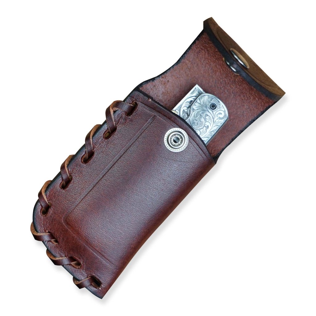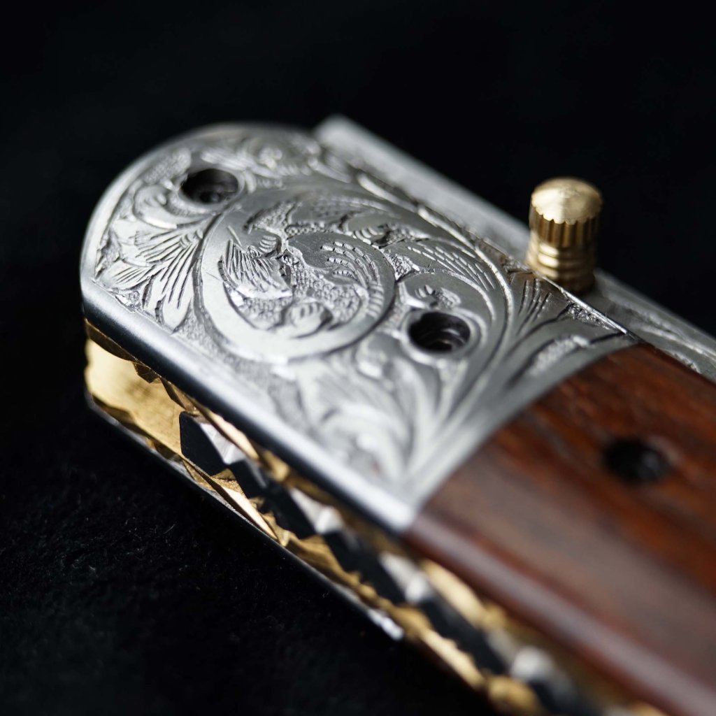 Rukojeť je pečlivě vyrobena ze vzácného palisandru (Sissowood) a doplněna o dekorativní nýt. Při výrobě byly uplatněny tradiční techniky spolu s precizním vytvrzením oceli na tvrdost cca 60 HRC. Tento praktický zavírák poskytuje spolehlivý výkon při myslivecké praxi i běžných outdoor aktivitách. Čepel je bezpečně jištěna pojistkou Liner-Lock. Součástí balení je ručně šité kožené pouzdro.