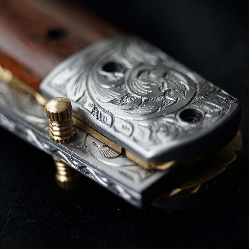 Exkluzivní nůž Dellinger Kizama D2 představuje bohatě zdobenou variantu oblíbeného modelu Sentinell. Je osazen čepelí z vysoce kvalitní nástrojové oceli D2, která je ručně zdobena jemnými rytinami. Stejné zdobení naleznete i na bolstru (záštitě), což noži dodává nádech starých kovářských mistrů. Čepel je vybavena oboustranným kolíčkem pro snadné otevírání jednou rukou.