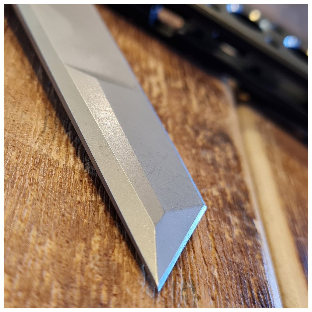 Dellinger Kuzan Silver představuje vrcholný model zavíracího nože s čepelí typu tanto. Tato geometrie, inspirovaná tradičními japonskými meči, poskytuje noži mimořádnou strukturální pevnost a vynikající schopnosti při krájení i bodání. Čepel o délce 140 mm je vyrobena z moderní práškové oceli CPM 20CV, která dosahuje extrémní tvrdosti 60 HRC, čímž zajišťuje dlouhou životnost ostří a vysokou odolnost proti korozi.